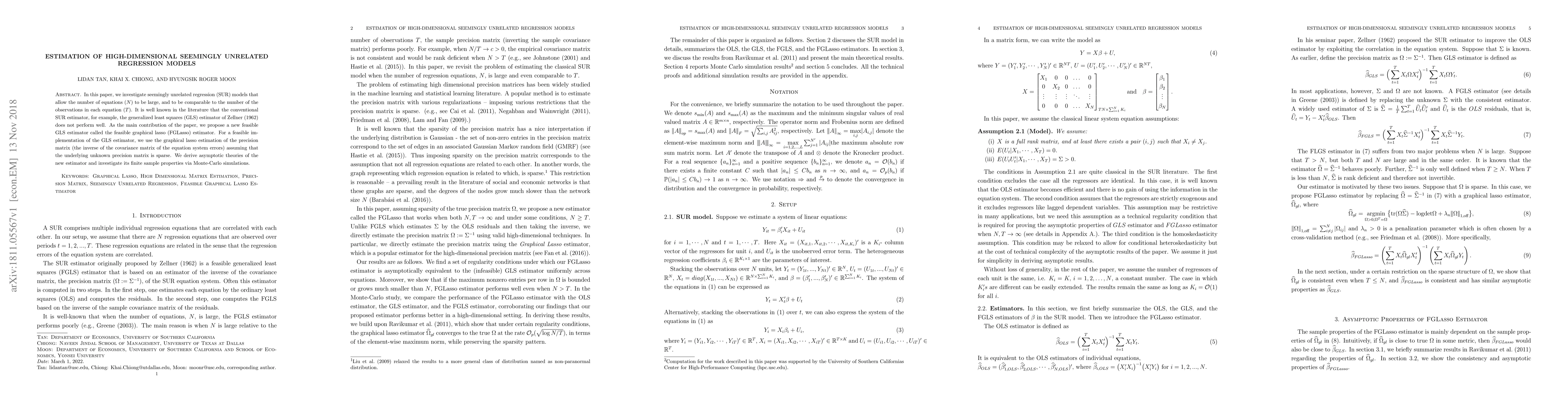This paper proposes a new feasible graphical lasso (FGLasso) estimator for high-dimensional seemingly unrelated regression (SUR) models where the number of equations is comparable to the number of observations. It addresses the inefficiency of conventional SUR estimators and evaluates the new estimator's asymptotic properties and finite sample performance through Monte-Carlo simulations.