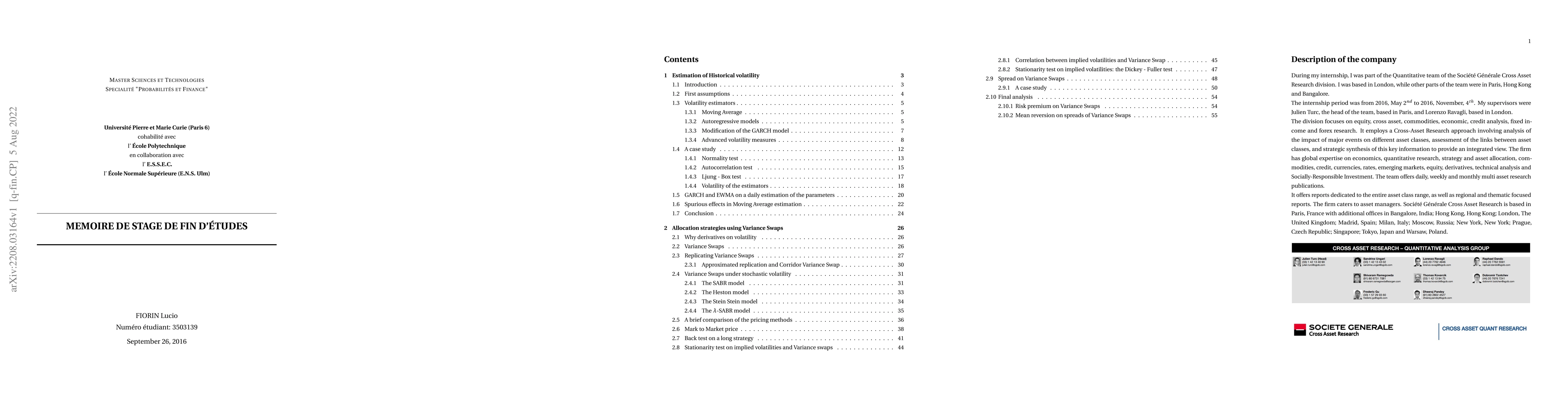 Summary: This study reviews methods for estimating historical volatility and explores pricing strategies for variance swaps, focusing on their application in allocation strategies.