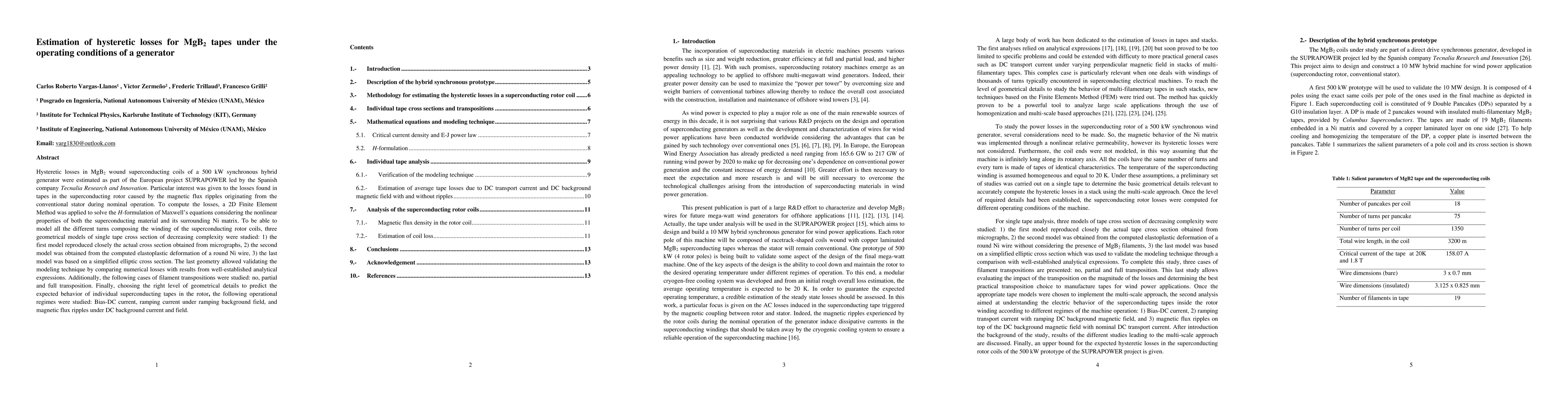 Hysteretic losses in MgB2 wound superconducting coils of a 500 kW synchronous hybrid generator were estimated as part of the European project SUPRAPOWER led by the Spanish company Tecnalia Research and Innovation. Particular interest was given to the losses found in tapes in the superconducting rotor caused by the magnetic flux ripples originating from the conventional stator during nominal operation. To compute the losses, a 2D Finite Element Method was applied to solve the H-formulation of Maxwell's equations considering the nonlinear properties of both the superconducting material and its surrounding Ni matrix. To be able to model all the different turns composing the winding of the superconducting rotor coils, three geometrical models of single tape cross section of decreasing complexity were studied: 1) the first model reproduced closely the actual cross section obtained from micrographs, 2) the second model was obtained from the computed elastoplastic deformation of a round Ni wire, 3) the last model was based on a simplified elliptic cross section. The last geometry allowed validating the modeling technique by comparing numerical losses with results from well-established analytical expressions. Additionally, the following cases of filament transpositions were studied: no, partial and full transposition. Finally, choosing the right level of geometrical details to predict the expected behavior of individual superconducting tapes in the rotor, the following operational regimes were studied: Bias-DC current, ramping current under ramping background field, and magnetic flux ripples under DC background current and field.