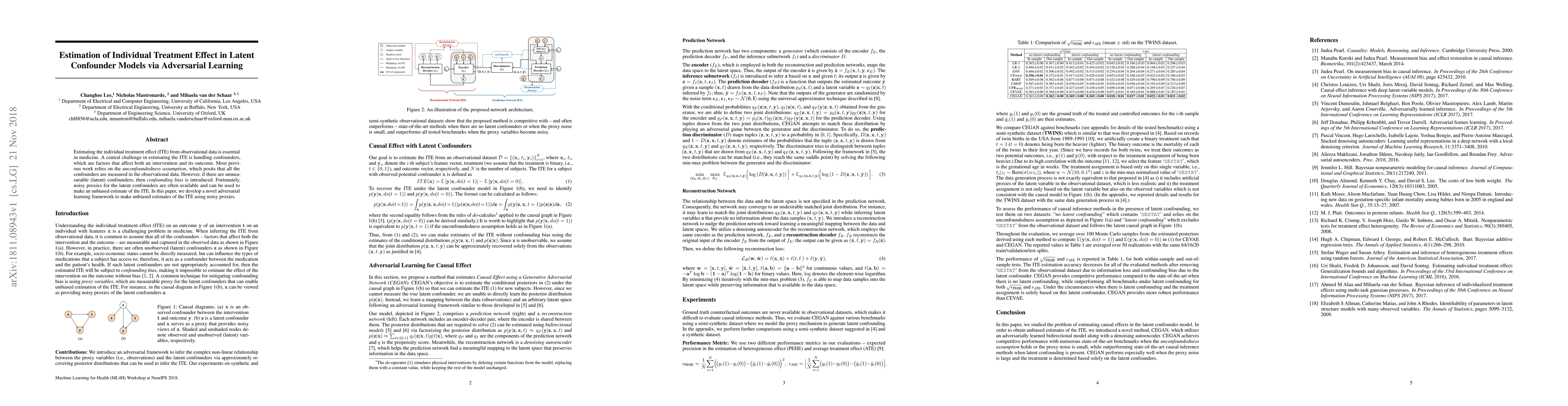 This paper proposes an adversarial learning framework to estimate individual treatment effects from observational data, addressing the challenge of latent confounders by leveraging noisy proxies for these unmeasured factors to achieve unbiased estimates.