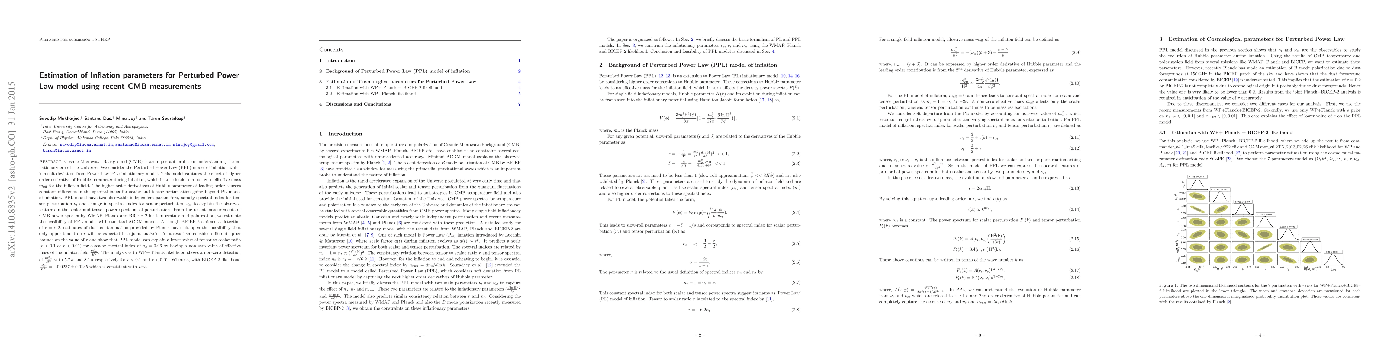 Cosmic Microwave Background (CMB) is an important probe for understanding the inflationary era of the Universe. We consider the Perturbed Power Law (PPL) model of inflation which is a soft deviation from Power Law (PL) inflationary model. This model captures the effect of higher order derivative of Hubble parameter during inflation, which in turn leads to a non-zero effective mass $m_{\rm eff}$ for the inflaton field. The higher order derivatives of Hubble parameter at leading order sources constant difference in the spectral index for scalar and tensor perturbation going beyond PL model of inflation. PPL model have two observable independent parameters, namely spectral index for tensor perturbation $\nu_t$ and change in spectral index for scalar perturbation $\nu_{st}$ to explain the observed features in the scalar and tensor power spectrum of perturbation. From the recent measurements of CMB power spectra by WMAP, Planck and BICEP-2 for temperature and polarization, we estimate the feasibility of PPL model with standard $\Lambda$CDM model. Although BICEP-2 claimed a detection of $r=0.2$, estimates of dust contamination provided by Planck have left open the possibility that only upper bound on $r$ will be expected in a joint analysis. As a result we consider different upper bounds on the value of $r$ and show that PPL model can explain a lower value of tensor to scalar ratio ($r<0.1$ or $r<0.01$) for a scalar spectral index of $n_s=0.96$ by having a non-zero value of effective mass of the inflaton field $\frac{m^2_{\rm eff}}{H^2}$. The analysis with WP+ Planck likelihood shows a non-zero detection of $\frac{m^2_{\rm eff}}{H^2}$ with $5.7\,\sigma$ and $8.1\,\sigma$ respectively for $r<0.1$ and $r<0.01$. Whereas, with BICEP-2 likelihood $\frac{m^2_{\rm eff}}{H^2} = -0.0237 \pm 0.0135$ which is consistent with zero.