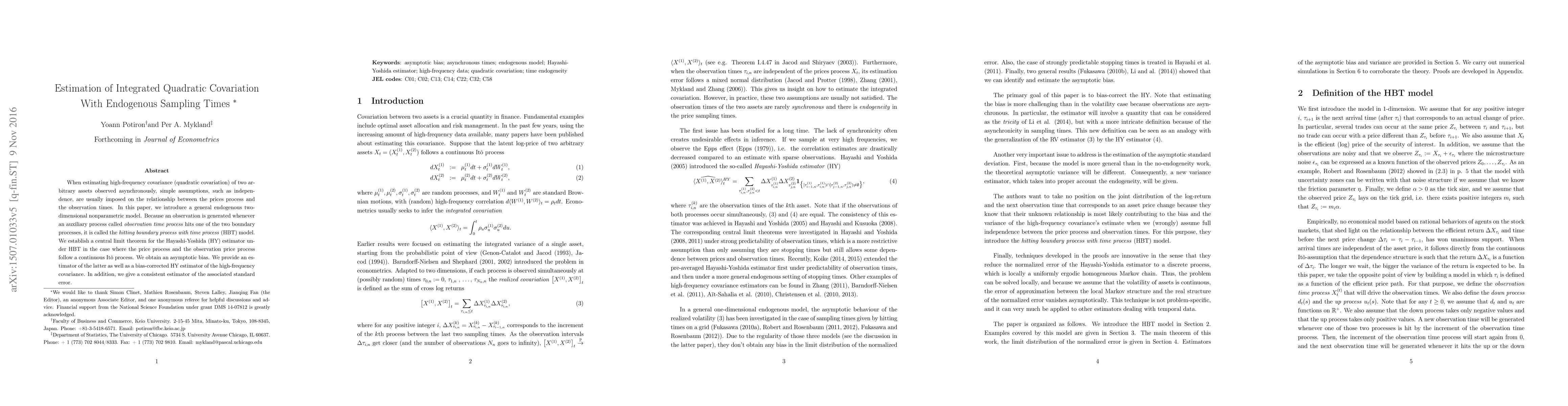 When estimating high-frequency covariance (quadratic covariation) of two arbitrary assets observed asynchronously, simple assumptions, such as independence, are usually imposed on the relationship between the prices process and the observation times. In this paper, we introduce a general endogenous two-dimensional nonparametric model. Because an observation is generated whenever an auxiliary process called observation time process hits one of the two boundary processes, it is called the hitting boundary process with time process (HBT) model. We establish a central limit theorem for the Hayashi-Yoshida (HY) estimator under HBT in the case where the price process and the observation price process follow a continuous Ito process. We obtain an asymptotic bias. We provide an estimator of the latter as well as a bias-corrected HY estimator of the high-frequency covariance. In addition, we give a consistent estimator of the associated standard error.