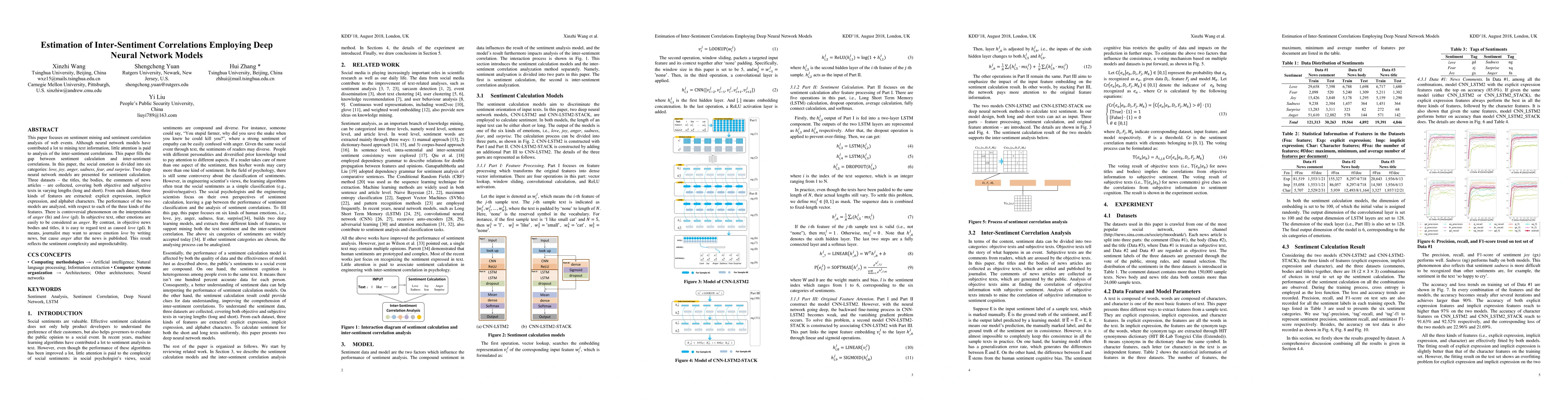 This paper focuses on sentiment mining and sentiment correlation analysis of web events. Although neural network models have contributed a lot to mining text information, little attention is paid to analysis of the inter-sentiment correlations. This paper fills the gap between sentiment calculation and inter-sentiment correlations. In this paper, the social emotion is divided into six categories: love, joy, anger, sadness, fear, and surprise. Two deep neural network models are presented for sentiment calculation. Three datasets - the titles, the bodies, the comments of news articles - are collected, covering both objective and subjective texts in varying lengths (long and short). From each dataset, three kinds of features are extracted: explicit expression, implicit expression, and alphabet characters. The performance of the two models are analyzed, with respect to each of the three kinds of the features. There is controversial phenomenon on the interpretation of anger (fn) and love (gd). In subjective text, other emotions are easily to be considered as anger. By contrast, in objective news bodies and titles, it is easy to regard text as caused love (gd). It means, journalist may want to arouse emotion love by writing news, but cause anger after the news is published. This result reflects the sentiment complexity and unpredictability.