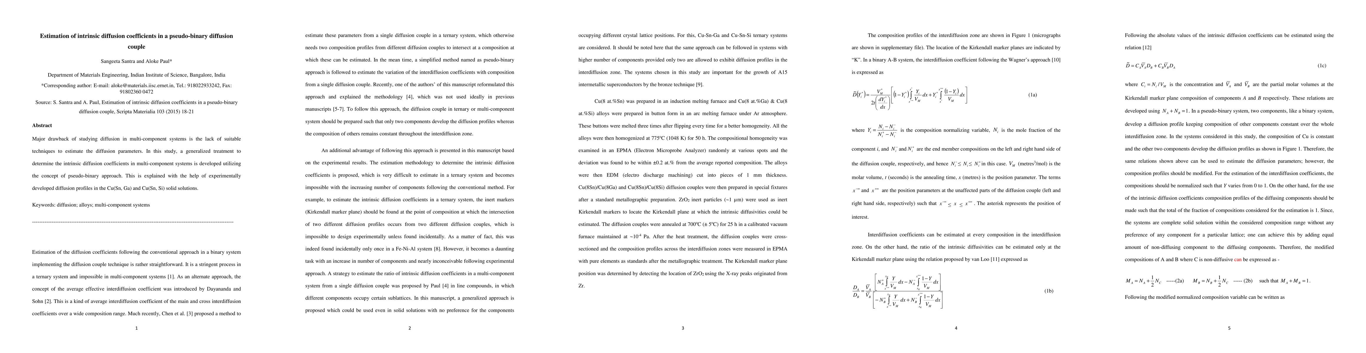 This paper develops a generalized method to estimate intrinsic diffusion coefficients in multi-component systems using a pseudo-binary approach, demonstrated through diffusion profiles in Cu(Sn, Ga) and Cu(Sn, Si) solid solutions. The technique aims to address the challenge of estimating diffusion parameters in complex systems.