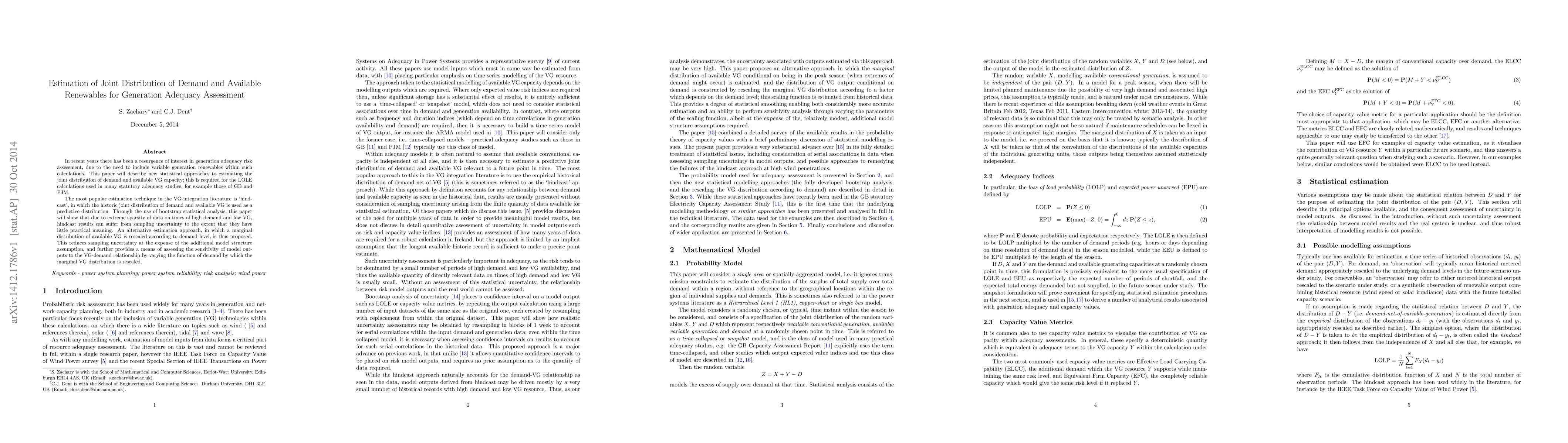 In recent years there has been a resurgence of interest in generation adequacy risk assessment, due to the need to include variable generation renewables within such calculations. This paper will describe new statistical approaches to estimating the joint distribution of demand and available VG capacity; this is required for the LOLE calculations used in many statutory adequacy studies, for example those of GB and PJM. The most popular estimation technique in the VG-integration literature is `hindcast', in which the historic joint distribution of demand and available VG is used as a predictive distribution. Through the use of bootstrap statistical analysis, this paper will show that due to extreme sparsity of data on times of high demand and low VG, hindcast results can suffer from sampling uncertainty to the extent that they have little practical meaning. An alternative estimation approach, in which a marginal distribution of available VG is rescaled according to demand level, is thus proposed. This reduces sampling uncertainty at the expense of the additional model structure assumption, and further provides a means of assessing the sensitivity of model outputs to the VG-demand relationship by varying the function of demand by which the marginal VG distribution is rescaled.