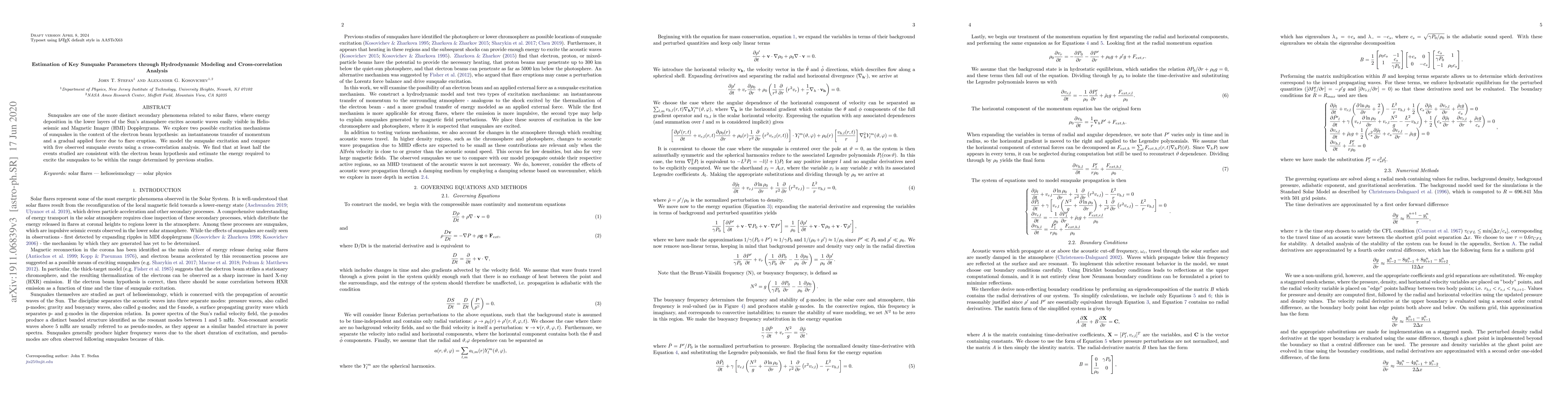 This research uses hydrodynamic modeling and cross-correlation analysis to study sunquake sources, finding that at least half of the studied events align with the electron beam hypothesis. It estimates the energy needed for sunquake excitation to fall within ranges from previous studies.