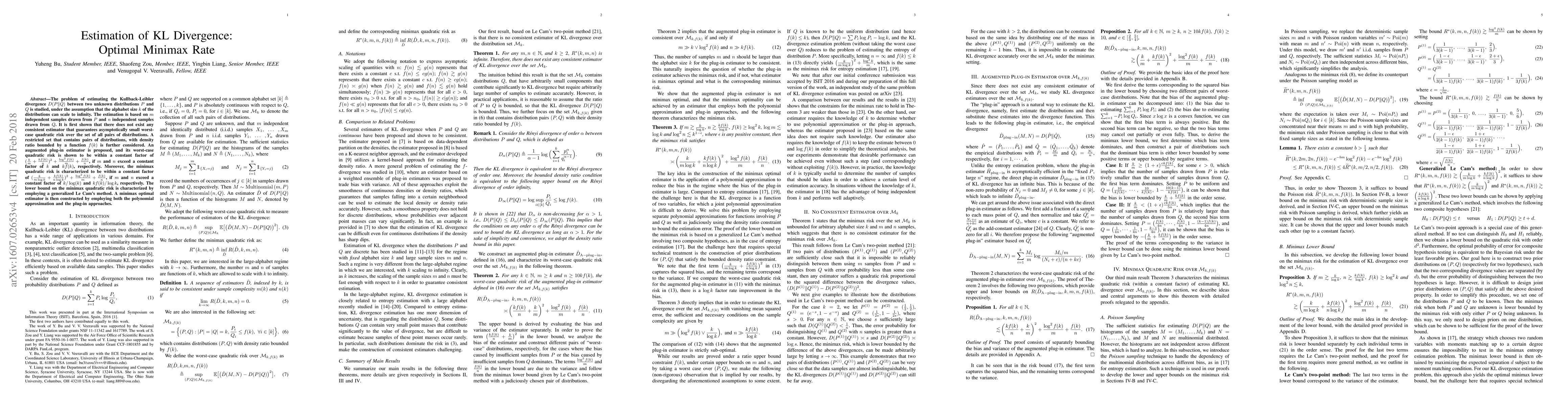 This paper investigates the estimation of the Kullback-Leibler divergence between two unknown distributions under potentially infinite alphabet sizes. It proposes an augmented plug-in estimator achieving optimal minimax rates and characterizes the minimax quadratic risk, establishing lower bounds using generalized Le Cam's method.