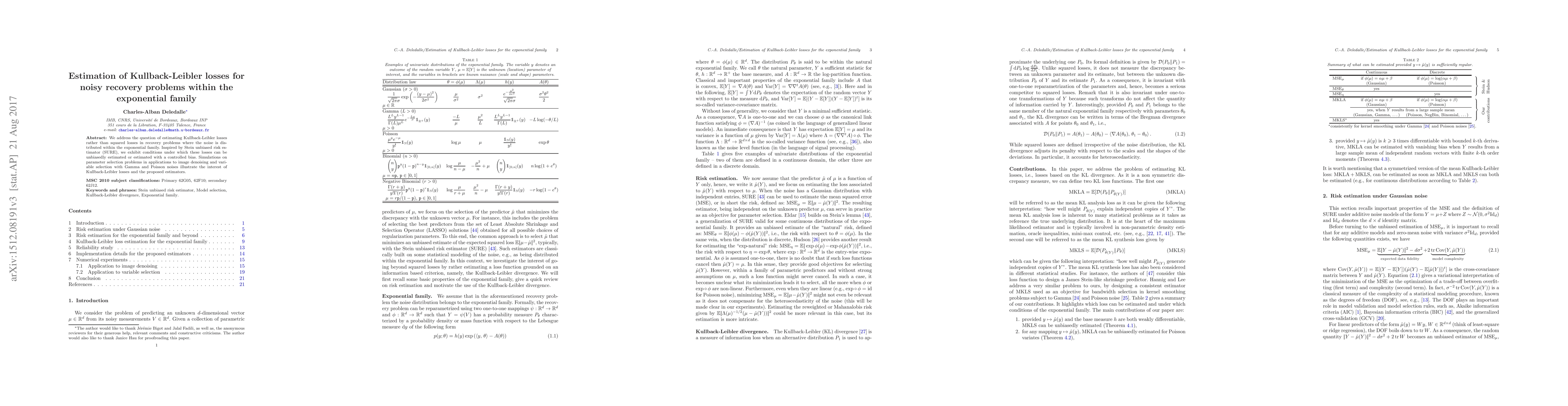 We address the question of estimating Kullback-Leibler losses rather than squared losses in recovery problems where the noise is distributed within the exponential family. Inspired by Stein unbiased risk estimator (SURE), we exhibit conditions under which these losses can be unbiasedly estimated or estimated with a controlled bias. Simulations on parameter selection problems in applications to image denoising and variable selection with Gamma and Poisson noises illustrate the interest of Kullback-Leibler losses and the proposed estimators.