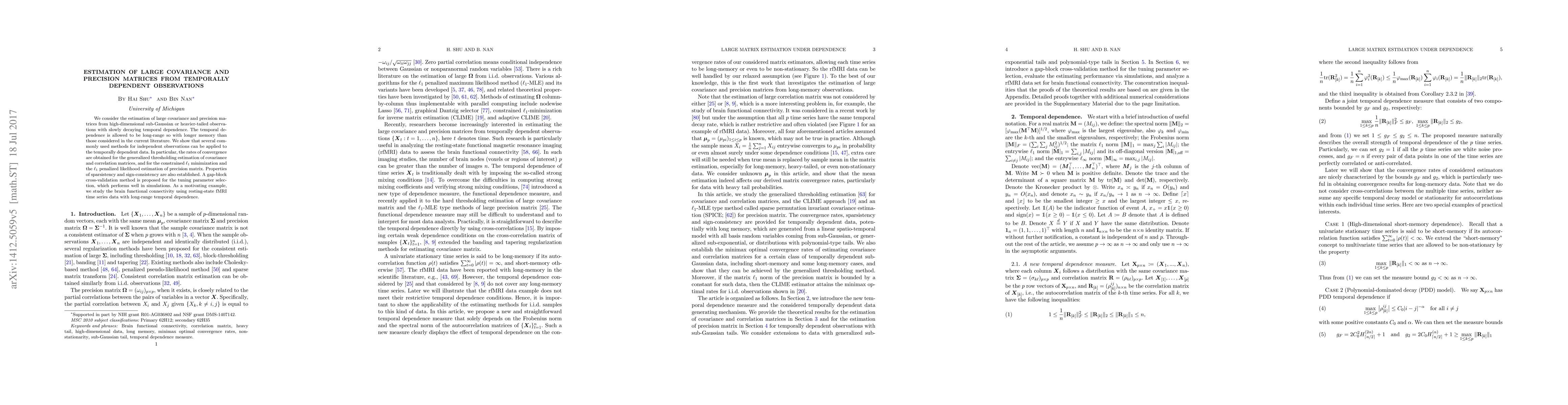 This paper develops methods for estimating large covariance and precision matrices from high-dimensional, temporally dependent observations, including those with long-range memory. It demonstrates the applicability of several estimation techniques to such data and establishes convergence rates, sparsity, and sign-consistency properties.