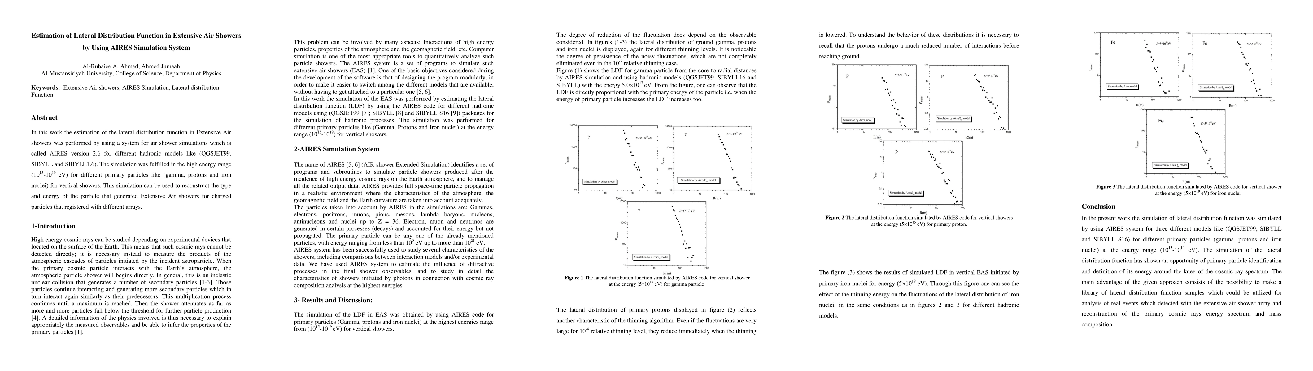 This paper estimates the lateral distribution function in extensive air showers using the AIRES simulation system, comparing different hadronic models across a high energy range for various primary particles. The simulation aids in reconstructing the type and energy of particles generating these showers.