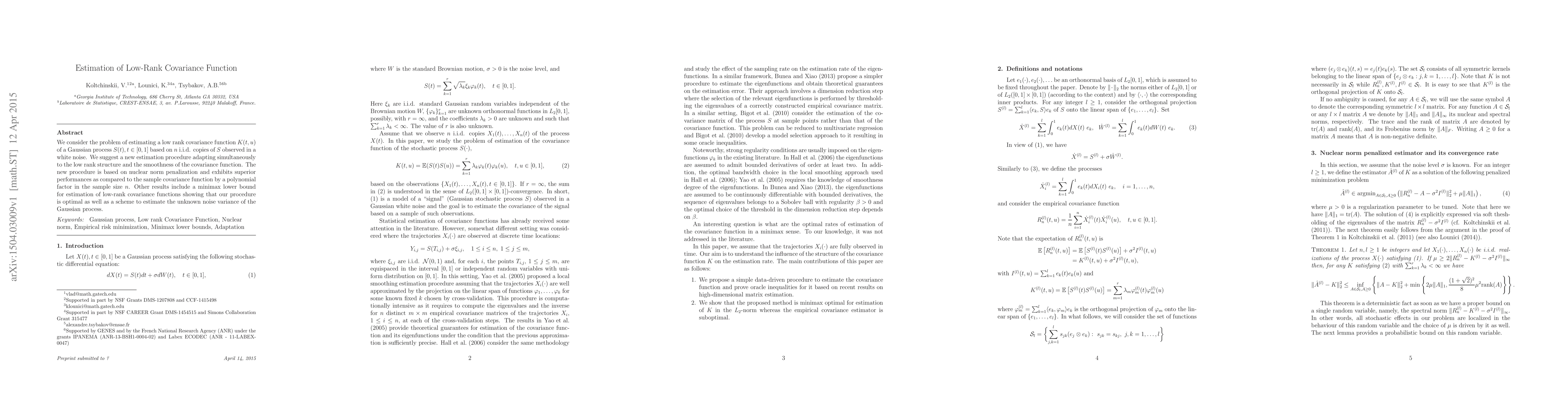 This paper proposes a novel estimation method for low-rank covariance functions of Gaussian processes observed in white noise, utilizing nuclear norm penalization. The method outperforms traditional sample covariance estimation and is shown to be optimal based on derived minimax lower bounds.