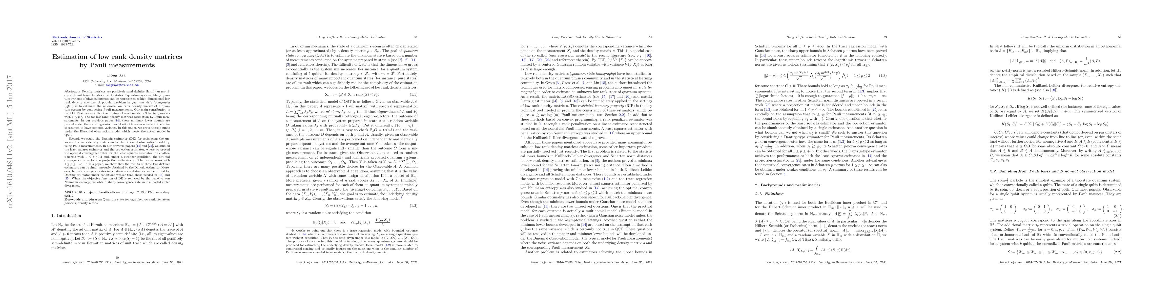 This paper establishes minimax lower bounds for estimating low rank density matrices via Pauli measurements under the Binomial observation model, improving upon previous Gaussian noise models. It also introduces the Dantzig estimator, showing it can outperform previous least squares and projection estimators with better convergence rates under weaker conditions.