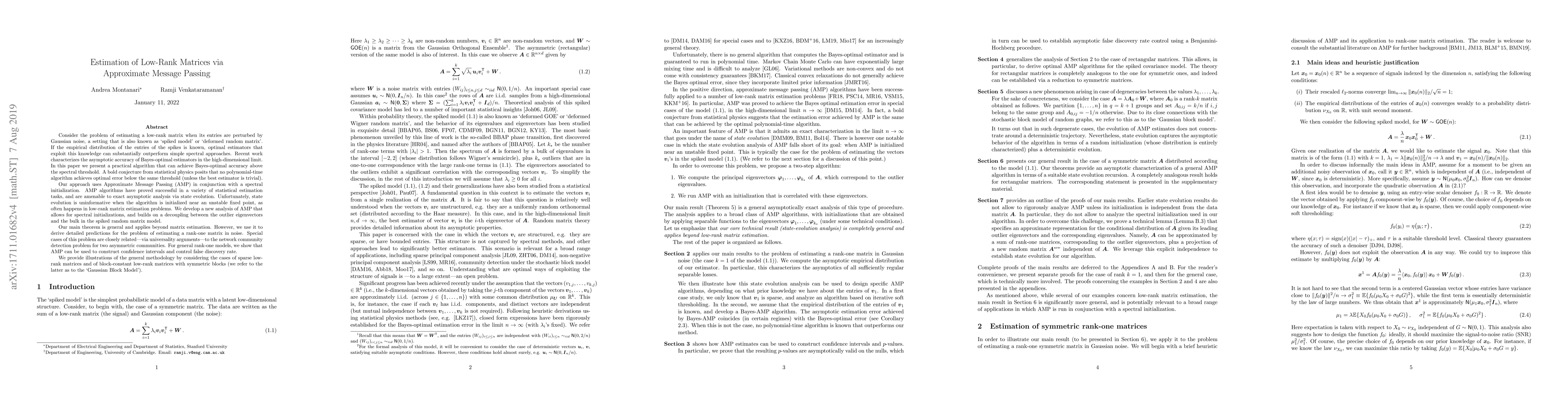 This paper proposes a practical algorithm using Approximate Message Passing (AMP) combined with spectral initialization to achieve Bayes-optimal accuracy for estimating low-rank matrices perturbed by Gaussian noise. The authors develop a new analysis of AMP that accommodates spectral initializations, providing detailed predictions for rank-one matrix estimation and applications to network community detection.