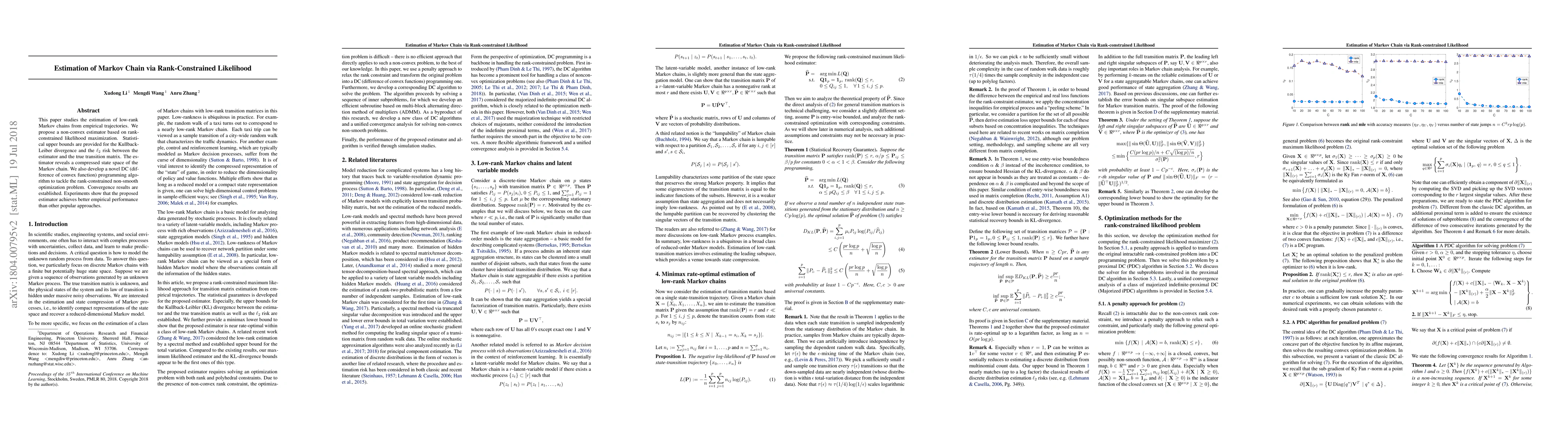 This paper proposes a non-convex estimator for low-rank Markov chains using rank-constrained likelihood maximization, providing statistical bounds and a novel DC programming algorithm for optimization. Empirical results show superior performance compared to other methods.
