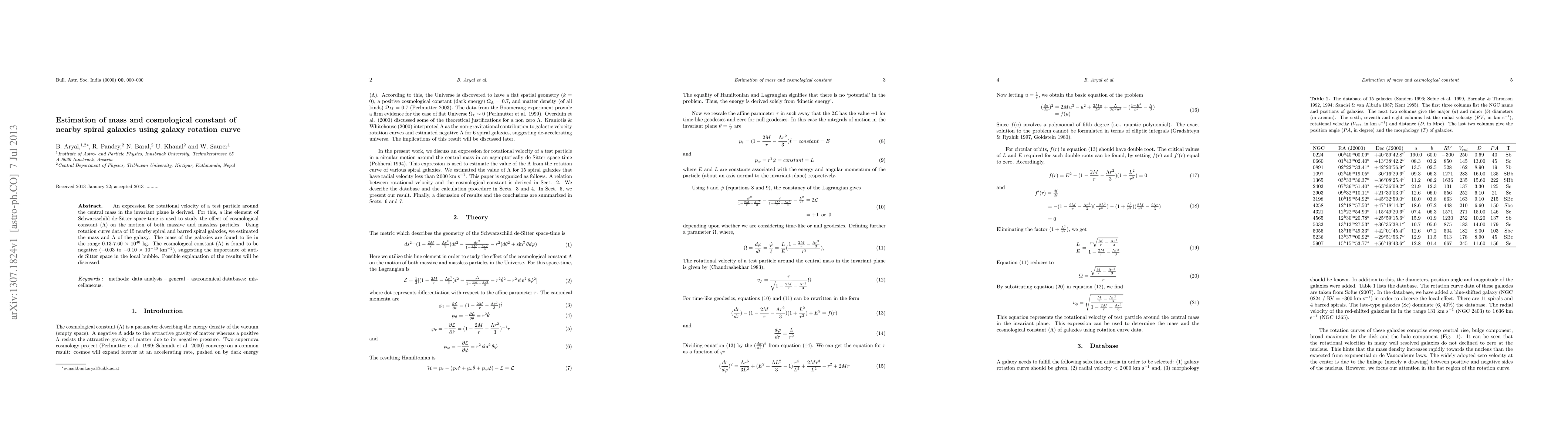 This paper derives an expression for rotational velocity in Schwarzschild de-Sitter space-time to estimate the mass and cosmological constant of 15 nearby spiral galaxies using their rotation curves, finding masses between 0.13-7.60 × 10$^{40}$ kg and a negative cosmological constant (−0.03 to −0.10 × 10$^{-40}$ km$^{-2}$).