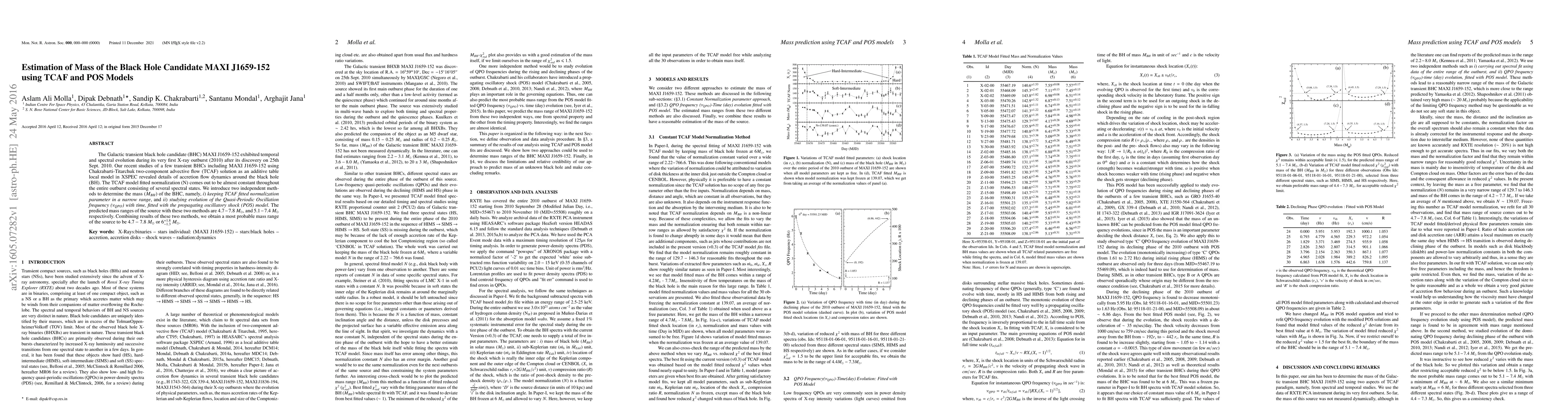 The Galactic transient black hole candidate (BHC) MAXI~J1659-152 exhibited temporal and spectral evolution during its very first X-ray outburst (2010) after its discovery on 25th Sept. 2010. Our recent studies of a few transient BHCs including MAXI~J1659-152 using Chakrabarti-Titarchuk two-component advective flow (TCAF) solution as an additive table local model in XSPEC revealed details of accretion flow dynamics around the black hole (BH). The TCAF model fitted normalization (N) comes out to be almost constant throughout the entire outburst consisting of several spectral states. We introduce two independent methods to determine the mass ($M_{BH}$) of the BHC, namely, {\it $i)$ keeping TCAF fitted normalization parameter in a narrow range}, and {\it $ii)$ studying evolution of the Quasi-Periodic Oscillation frequency ($\nu_{QPO}$) with time, fitted with the propagating oscillatory shock (POS) model}. The predicted mass ranges of the source with these two methods are $4.7-7.8~M_\odot$, and $5.1-7.4~M_\odot$ respectively. Combining results of these two methods, we obtain a most probable mass range of the source to be $4.7-7.8~M_\odot$ or $6^{+1.8}_{-1.3}~M_\odot$.
