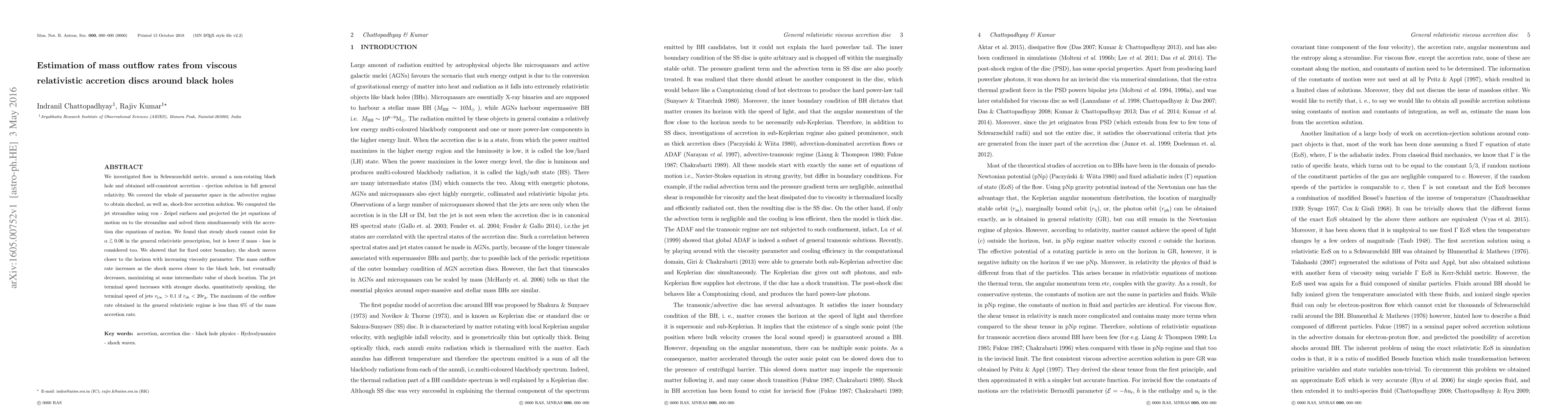 This paper investigates mass outflow rates from viscous relativistic accretion discs around non-rotating black holes, finding that steady shocks cannot exist for $\alpha \gsim0.06$ and that the maximum outflow rate is less than $6\%$ of the accretion rate, peaking at an intermediate shock location.