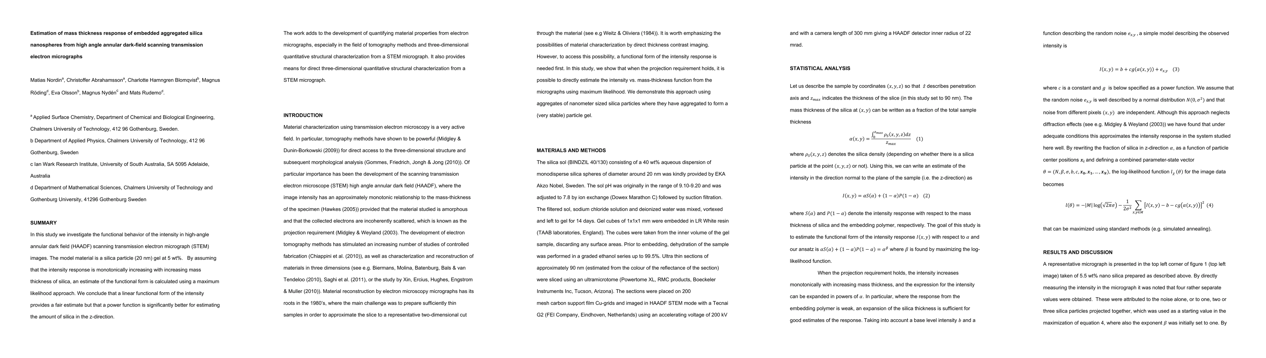 In this study we investigate the functional behavior of the intensity in high-angle annular dark field (HAADF) scanning transmission electron micrograph (STEM) images. The model material is a silica particle (20 nm) gel at 5 wt%. By assuming that the intensity response is monotonically increasing with increasing mass thickness of silica, an estimate of the functional form is calculated using a maximum likelihood approach. We conclude that a linear functional form of the intensity provides a fair estimate but that a power function is significantly better for estimating the amount of silica in the z-direction. The work adds to the development of quantifying material properties from electron micrographs, especially in the field of tomography methods and three-dimensional quantitative structural characterization from a STEM micrograph. It also provides means for direct three-dimensional quantitative structural characterization from a STEM micrograph.
