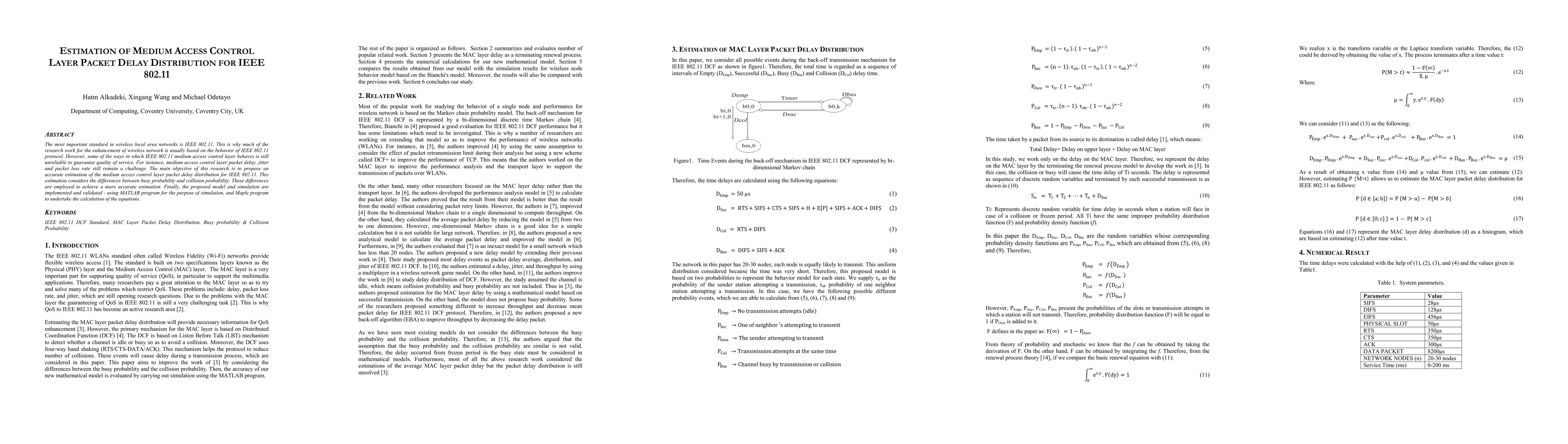 The most important standard in wireless local area networks is IEEE 802.11. This is why much of the research work for the enhancement of wireless network is usually based on the behavior of IEEE 802.11 protocol. However, some of the ways in which IEEE 802.11 medium access control layer behaves is still unreliable to guarantee quality of service. For instance, medium access control layer packet delay, jitter and packet loss rate still remain a challenge. The main objective of this research is to propose an accurate estimation of the medium access control layer packet delay distribution for IEEE 802.11. This estimation considers the differences between busy probability and collision probability. These differences are employed to achieve a more accurate estimation. Finally, the proposed model and simulation are implemented and validated - using MATLAB program for the purpose of simulation, and Maple program to undertake the calculation of the equations.