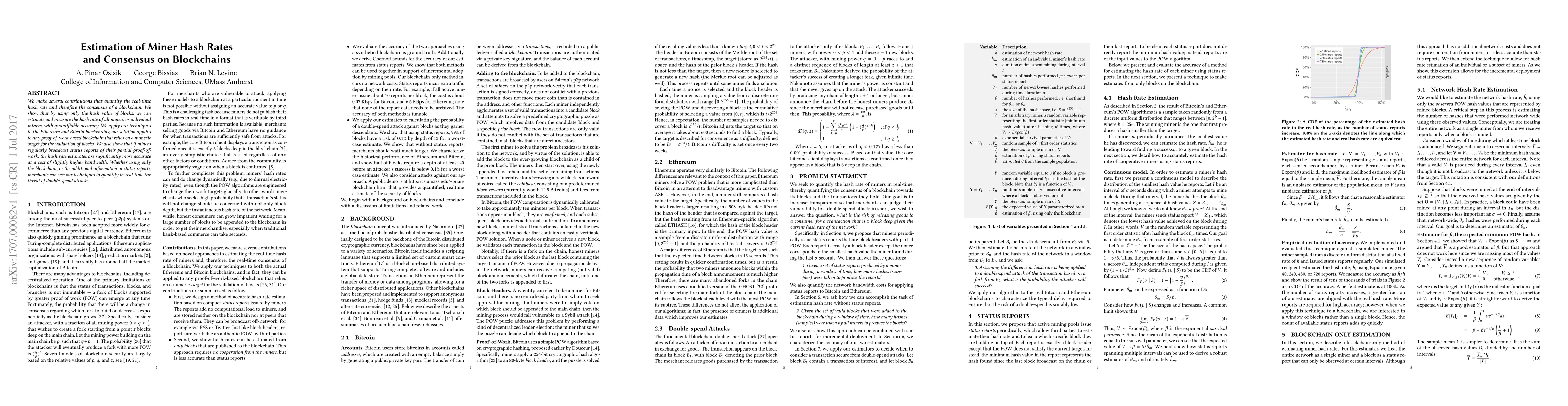 We make several contributions that quantify the real-time hash rate and therefore the consensus of a blockchain. We show that by using only the hash value of blocks, we can estimate and measure the hash rate of all miners or individual miners, with quanti able accuracy. We apply our techniques to the Ethereum and Bitcoin blockchains; our solution applies to any proof-of-work-based blockchain that relies on a numeric target for the validation of blocks. We also show that if miners regularly broadcast status reports of their partial proof-of- work, the hash rate estimates are signi cantly more accurate at a cost of slightly higher bandwidth. Whether using only the blockchain, or the additional information in status reports, merchants can use our techniques to quantify in real-time the threat of double-spend attacks.