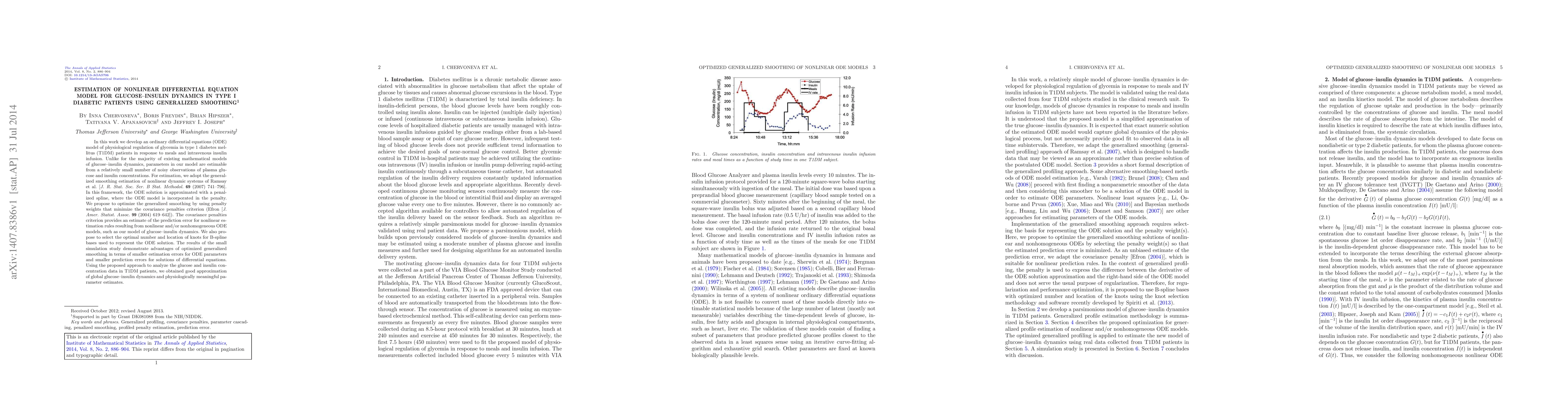 This paper develops an ordinary differential equation model for glucose-insulin dynamics in type 1 diabetic patients, employing generalized smoothing to estimate parameters from limited noisy data. The approach optimizes the smoothing method using a covariance penalties criterion to minimize prediction errors, yielding accurate parameter estimates and solutions.