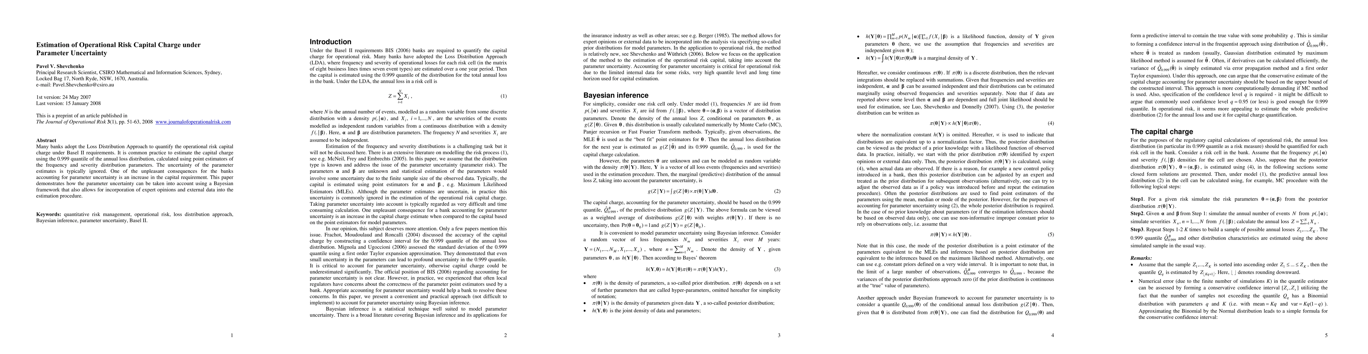 This paper proposes a Bayesian framework for estimating operational risk capital charge under Basel II, addressing the often-ignored parameter uncertainty. It shows that incorporating parameter uncertainty can increase capital requirements, but it also allows for the integration of expert opinions and external data to improve estimation accuracy.