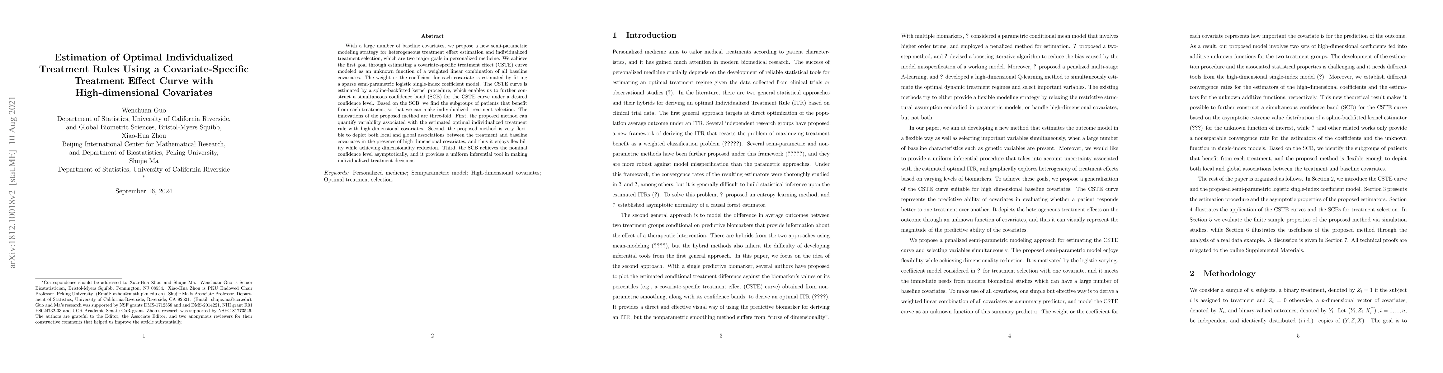 This paper proposes a semi-parametric modeling strategy to estimate heterogeneous treatment effects and select individualized treatment rules using high-dimensional covariates. The method estimates a covariate-specific treatment effect curve and constructs a simultaneous confidence band, enabling the identification of patient subgroups for optimal treatment decisions.