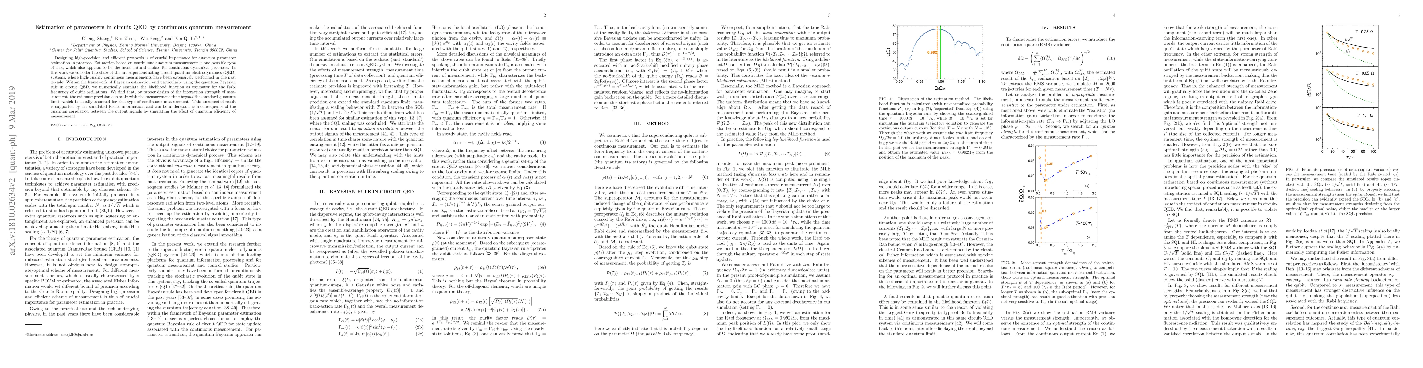 This paper investigates high-precision estimation of parameters in superconducting circuit quantum-electrodynamics (QED) using continuous quantum measurement. The authors demonstrate that by optimizing measurement interaction strength, the estimation precision can exceed the standard quantum limit, attributed to quantum correlations in time between output signals.
