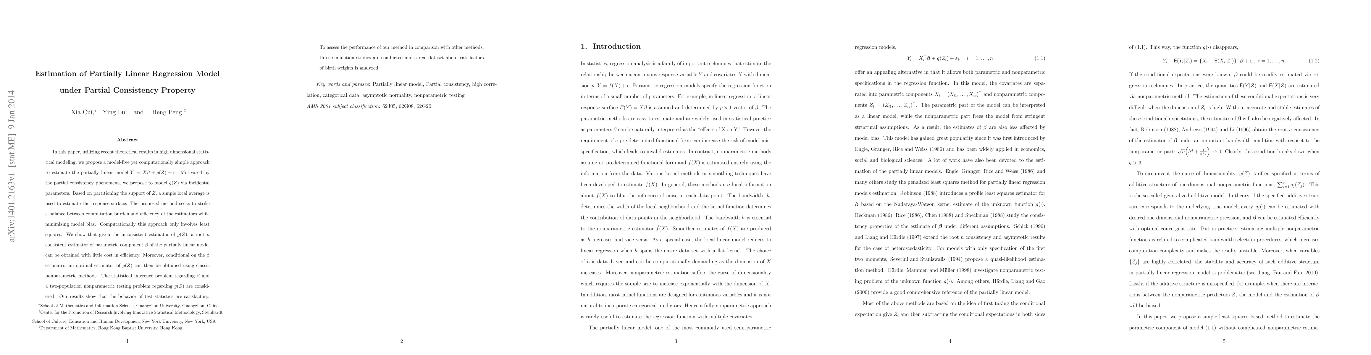 In this paper, utilizing recent theoretical results in high dimensional statistical modeling, we propose a model-free yet computationally simple approach to estimate the partially linear model $Y=X\beta+g(Z)+\varepsilon$. Motivated by the partial consistency phenomena, we propose to model $g(Z)$ via incidental parameters. Based on partitioning the support of $Z$, a simple local average is used to estimate the response surface. The proposed method seeks to strike a balance between computation burden and efficiency of the estimators while minimizing model bias. Computationally this approach only involves least squares. We show that given the inconsistent estimator of $g(Z)$, a root $n$ consistent estimator of parametric component $\beta$ of the partially linear model can be obtained with little cost in efficiency. Moreover, conditional on the $\beta$ estimates, an optimal estimator of $g(Z)$ can then be obtained using classic nonparametric methods. The statistical inference problem regarding $\beta$ and a two-population nonparametric testing problem regarding $g(Z)$ are considered. Our results show that the behavior of test statistics are satisfactory. To assess the performance of our method in comparison with other methods, three simulation studies are conducted and a real dataset about risk factors of birth weights is analyzed.
