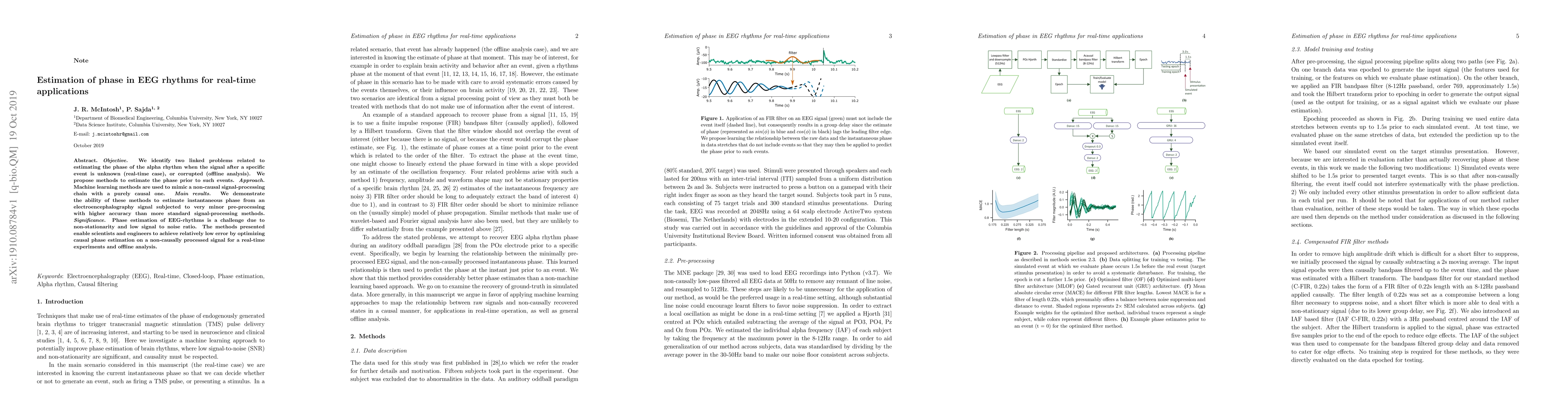 This paper proposes machine learning methods to estimate the phase of alpha rhythms in EEG signals in real-time and offline scenarios, achieving higher accuracy than standard signal-processing techniques. The approach optimizes causal phase estimation on a non-causally processed signal, addressing the challenges of non-stationarity and low signal-to-noise ratio.