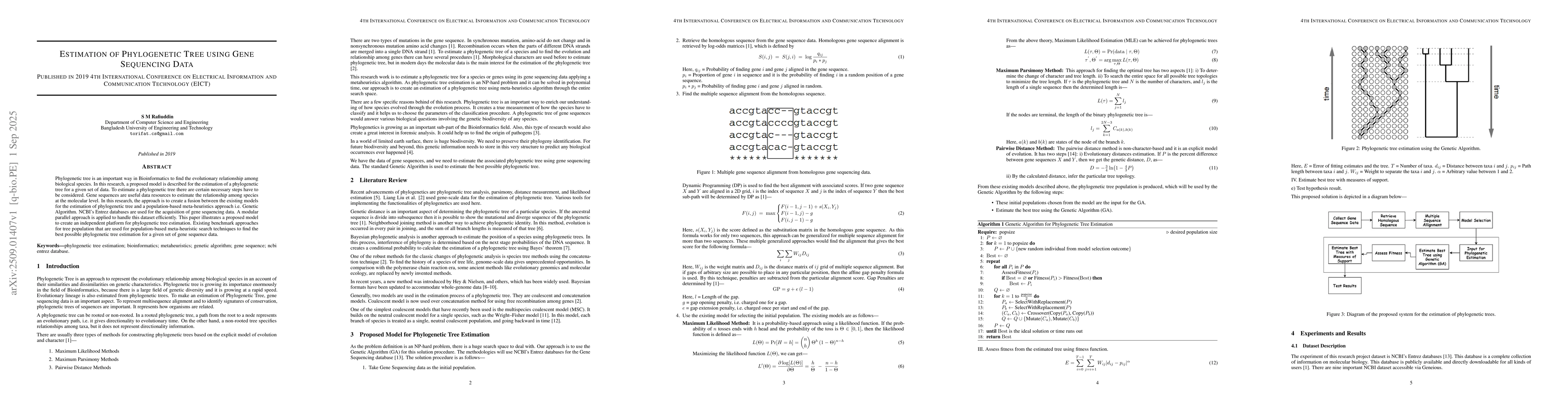 A phylogenetic tree is an important way in Bioinformatics to find the evolutionary relationship among biological species. In this research, a proposed model is described for the estimation of a phylogenetic tree for a given set of data. To estimate a phylogenetic tree there are certain necessary steps have to be considered. Gene sequences are useful data resources to estimate the relationship among species at the molecular level. In this research, the approach is to create a fusion between the existing models for the estimation of phylogenetic trees and a population-based meta-heuristics approach, i.e., Genetic Algorithm. NCBI's Entrez databases are used for the acquisition of gene sequencing data. A modular parallel approach is applied to handle this dataset efficiently. This paper illustrates a proposed model to create an independent platform for phylogenetic tree estimation. Existing benchmark approaches for tree population that are used for population-based meta-heuristic search techniques to find the best possible phylogenetic tree estimation for a given set of gene sequence data.