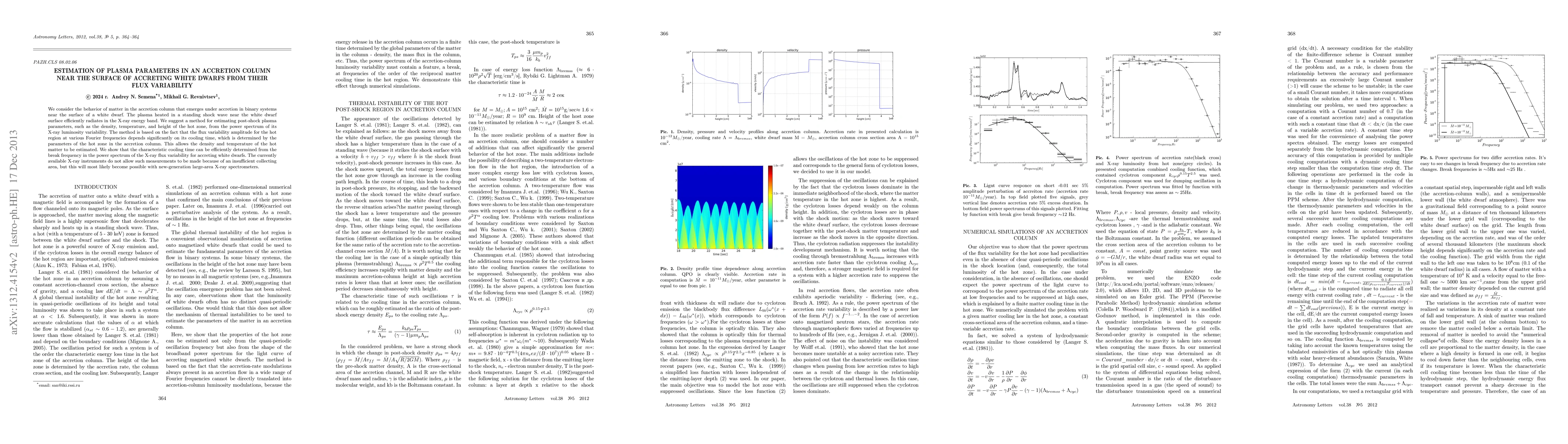 This paper proposes a method to estimate the density, temperature, and height of plasma in an accretion column near a white dwarf by analyzing the X-ray flux variability. The method relies on the relationship between the variability amplitude and the cooling time of the hot plasma, which can be determined from the break frequency in the power spectrum of X-ray luminosity variability.