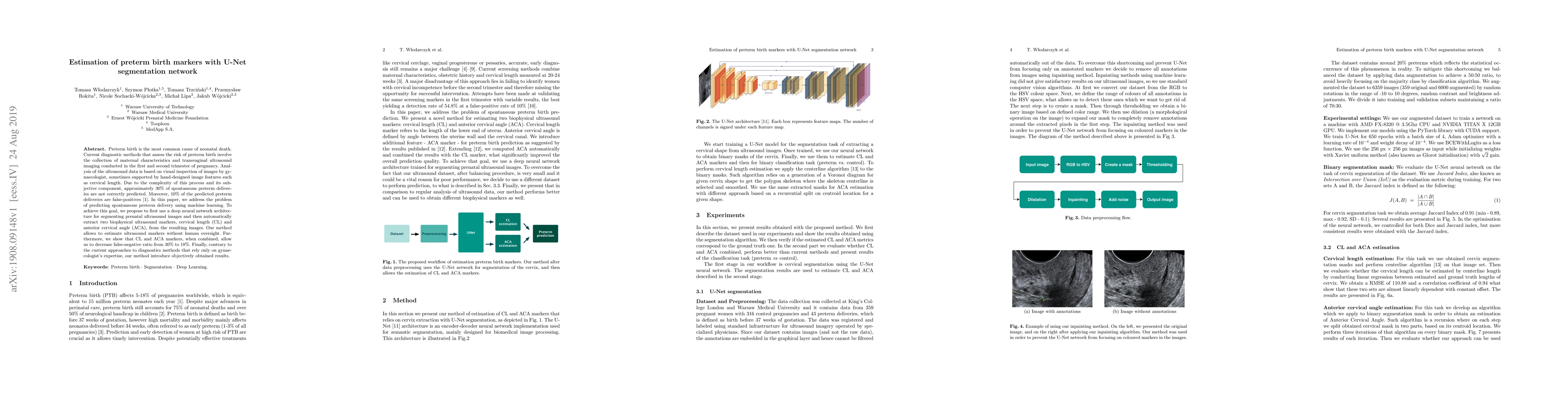 Preterm birth is the most common cause of neonatal death. Current diagnostic methods that assess the risk of preterm birth involve the collection of maternal characteristics and transvaginal ultrasound imaging conducted in the first and second trimester of pregnancy. Analysis of the ultrasound data is based on visual inspection of images by gynaecologist, sometimes supported by hand-designed image features such as cervical length. Due to the complexity of this process and its subjective component, approximately 30% of spontaneous preterm deliveries are not correctly predicted. Moreover, 10% of the predicted preterm deliveries are false-positives. In this paper, we address the problem of predicting spontaneous preterm delivery using machine learning. To achieve this goal, we propose to first use a deep neural network architecture for segmenting prenatal ultrasound images and then automatically extract two biophysical ultrasound markers, cervical length (CL) and anterior cervical angle (ACA), from the resulting images. Our method allows to estimate ultrasound markers without human oversight. Furthermore, we show that CL and ACA markers, when combined, allow us to decrease false-negative ratio from 30% to 18%. Finally, contrary to the current approaches to diagnostics methods that rely only on gynaecologist's expertise, our method introduce objectively obtained results.