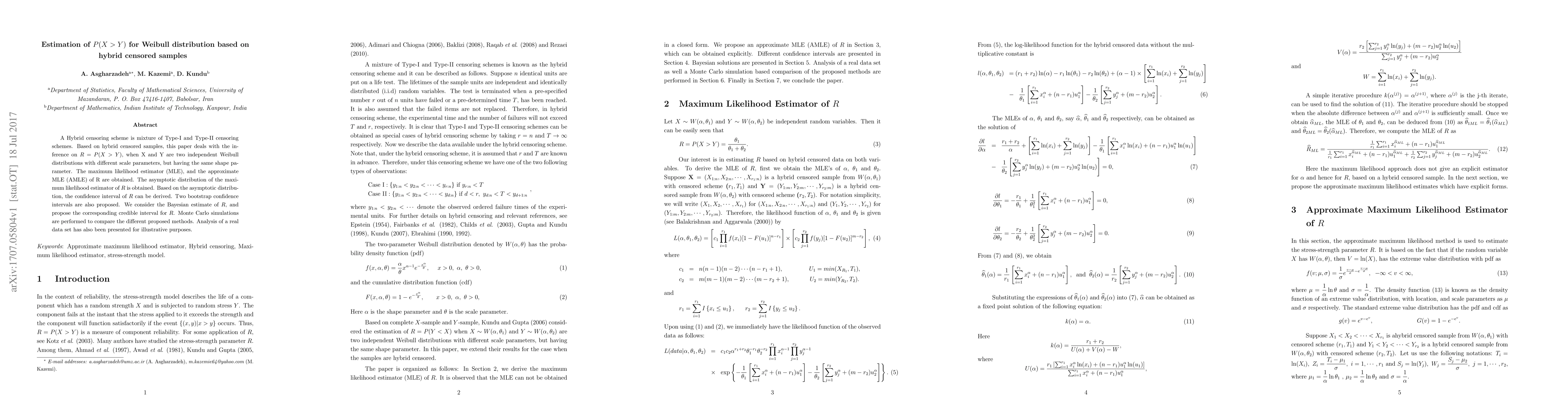 A Hybrid censoring scheme is mixture of Type-I and Type-II censoring schemes. Based on hybrid censored samples, this paper deals with the in- ference on R = P(X > Y ), when X and Y are two independent Weibull distributions with different scale parameters, but having the same shape pa- rameter. The maximum likelihood estimator (MLE), and the approximate MLE (AMLE) of R are obtained. The asymptotic distribution of the maxi- mum likelihood estimator of R is obtained. Based on the asymptotic distribu- tion, the confidence interval of R can be derived. Two bootstrap confidence intervals are also proposed. We consider the Bayesian estimate of R, and propose the corresponding credible interval for R. Monte Carlo simulations are performed to compare the different proposed methods. Analysis of a real data set has also been presented for illustrative purposes.