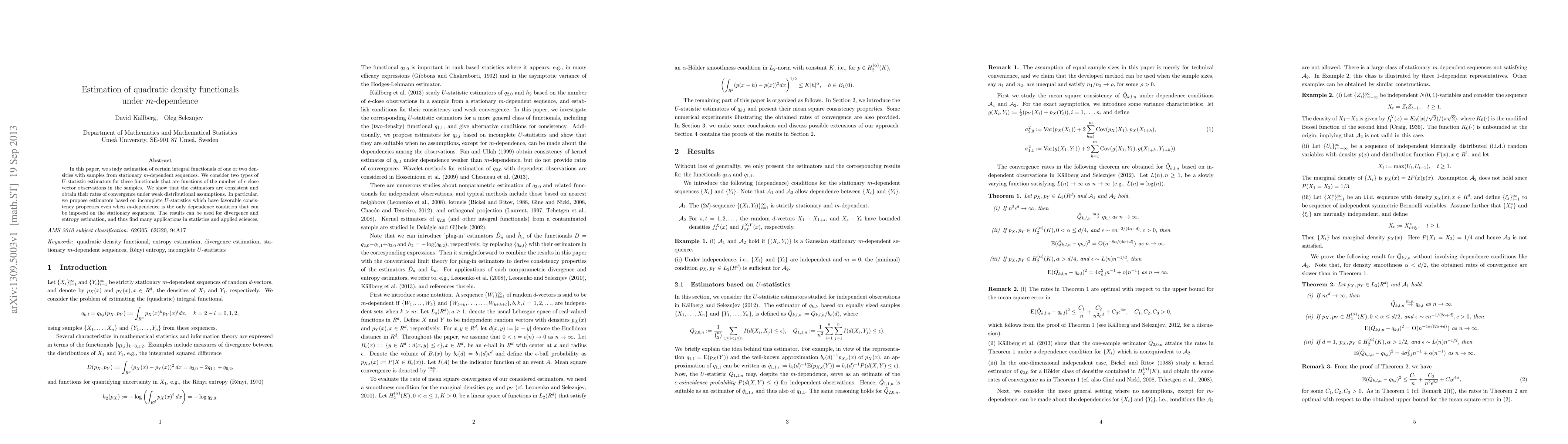 This paper proposes U-statistic estimators for quadratic density functionals in stationary m-dependent sequences, showing they are consistent with favorable consistency properties.
