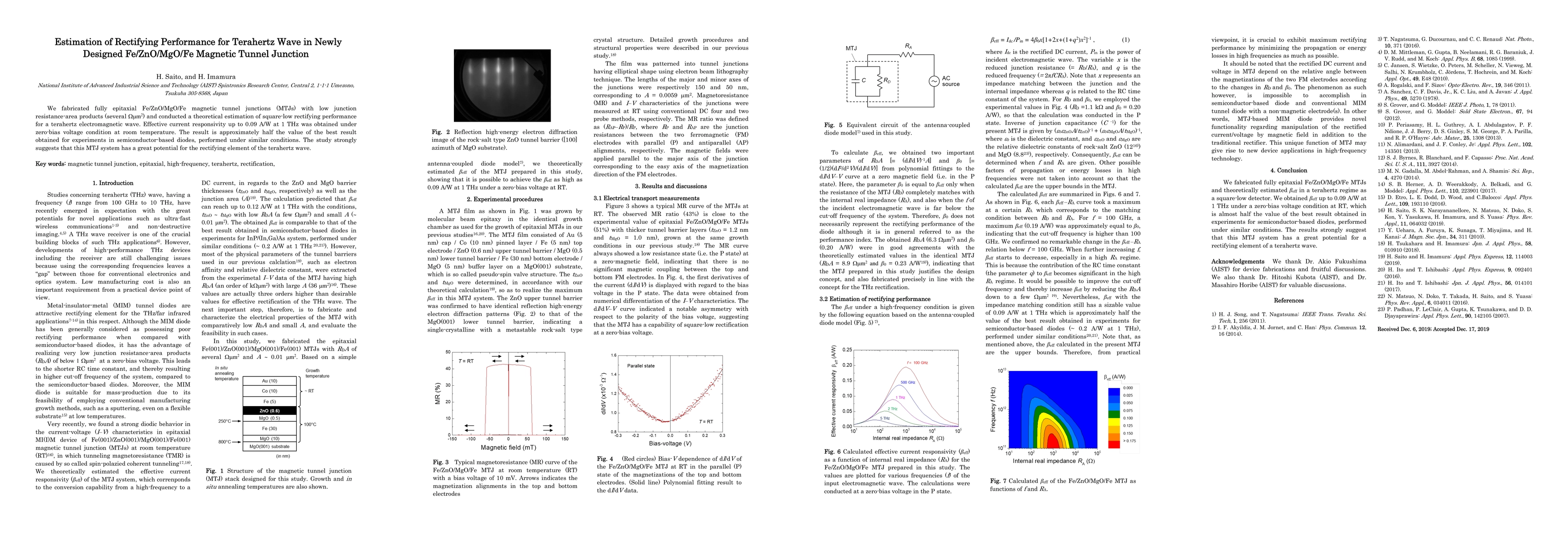This study fabricates Fe/ZnO/MgO/Fe magnetic tunnel junctions with low resistance and estimates their rectifying performance for terahertz waves, achieving an effective current responsivity of 0.09 A/W at 1 THz. The results indicate significant potential for these MTJs as terahertz wave rectifying elements.