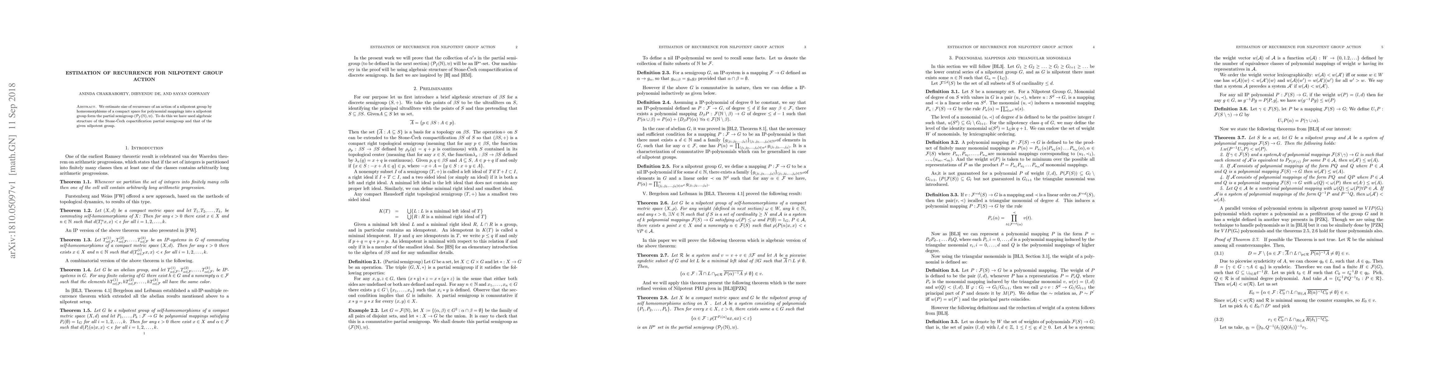 Summary: This research estimates the recurrence size of nilpotent group actions via homeomorphisms on compact spaces, focusing on polynomial mappings into nilpotent groups, utilizing the algebraic structures of the Stone-\v{C}ech compactification partial semigroup and the given nilpotent group.