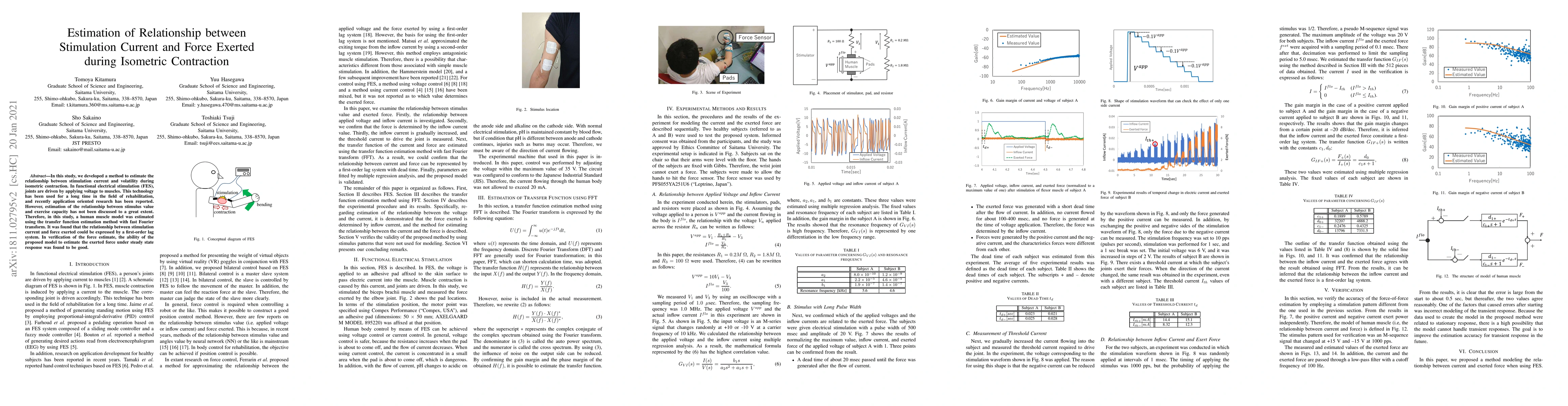 This study developed a method to estimate the relationship between stimulation current and force during isometric contraction using a human muscle model. The model, based on transfer function estimation with fast Fourier transform, showed good accuracy in estimating exerted force under steady state response.