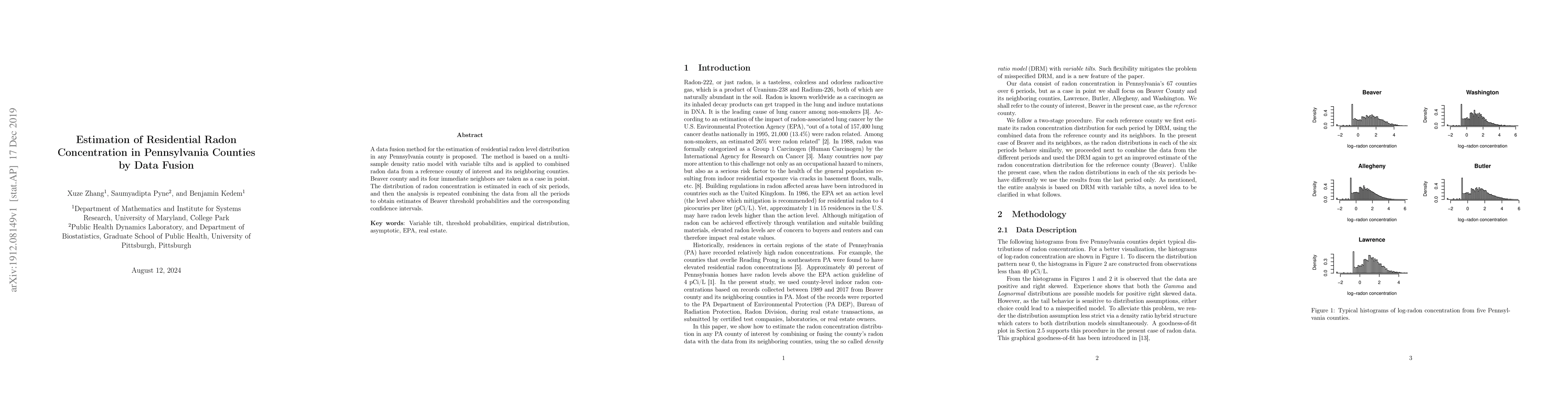 A data fusion method for the estimation of residential radon level distribution in any Pennsylvania county is proposed. The method is based on a multi-sample density ratio model with variable tilts and is applied to combined radon data from a reference county of interest and its neighboring counties. Beaver county and its four immediate neighbors are taken as a case in point. The distribution of radon concentration is estimated in each of six periods, and then the analysis is repeated combining the data from all the periods to obtain estimates of Beaver threshold probabilities and the corresponding confidence intervals.