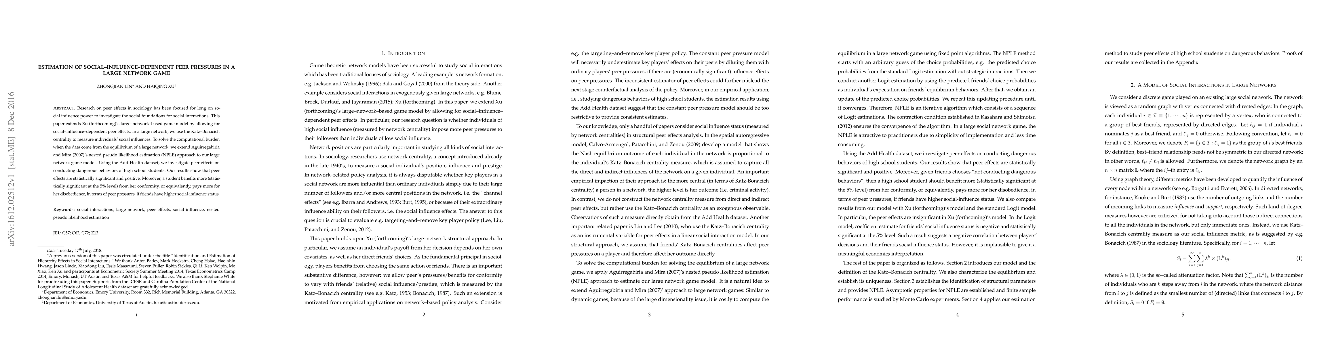 This paper extends a large-network game model to estimate social-influence-dependent peer pressures, using the Katz-Bonacich centrality and a modified nested pseudo likelihood estimation approach. Findings from the Add Health dataset indicate significant positive peer effects on dangerous behaviors among high school students, with higher social-influence status among peers amplifying these effects.