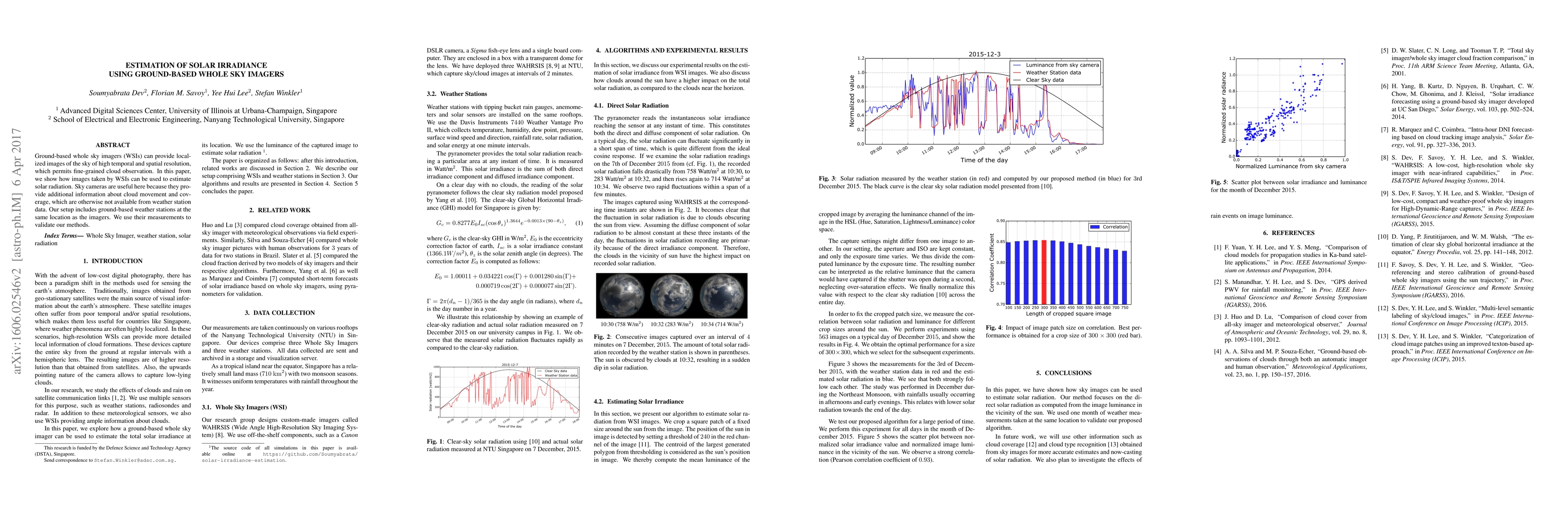 This paper demonstrates how ground-based whole sky imagers (WSIs) can estimate solar irradiance by capturing high-resolution sky images, providing detailed cloud movement and coverage data. The method is validated using simultaneous measurements from ground-based weather stations.