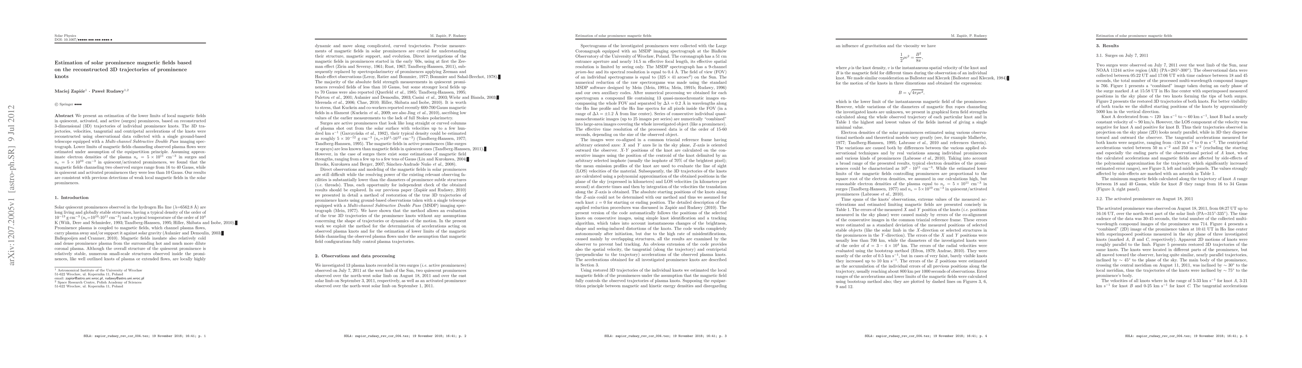 Researchers estimate lower limits of magnetic fields in solar prominences based on 3D knot trajectories, finding weak fields of up to 40 Gauss in surges and less than 10 Gauss in quiescent/activated prominences.
