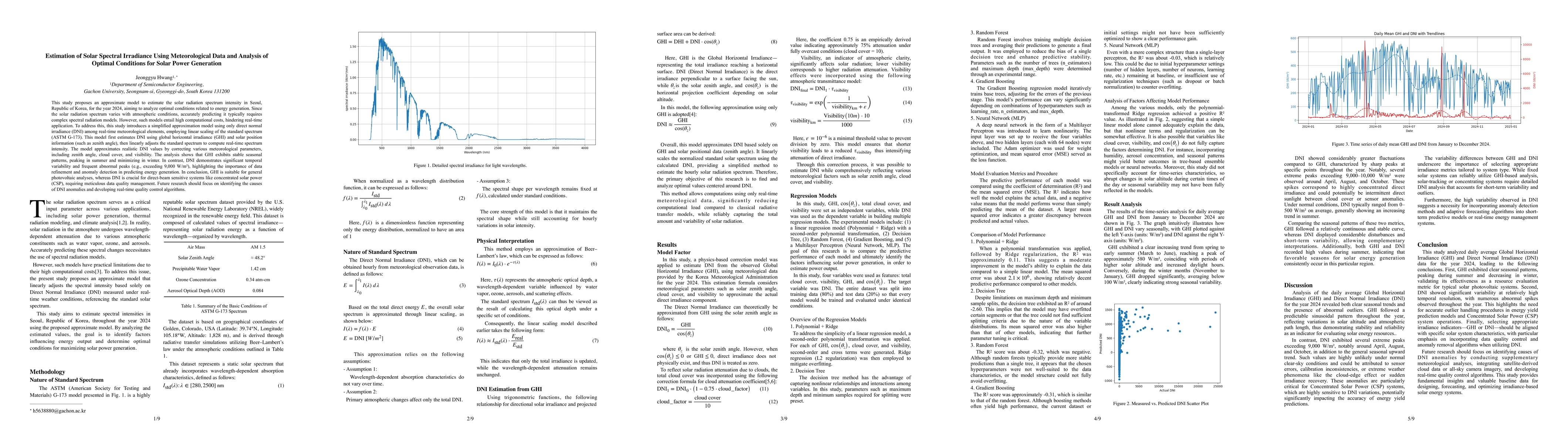 A simplified model estimates solar radiation spectrum intensity in Seoul using direct normal irradiance and linear scaling of a standard spectrum, finding significant variability in direct normal irradiance due to meteorological factors.