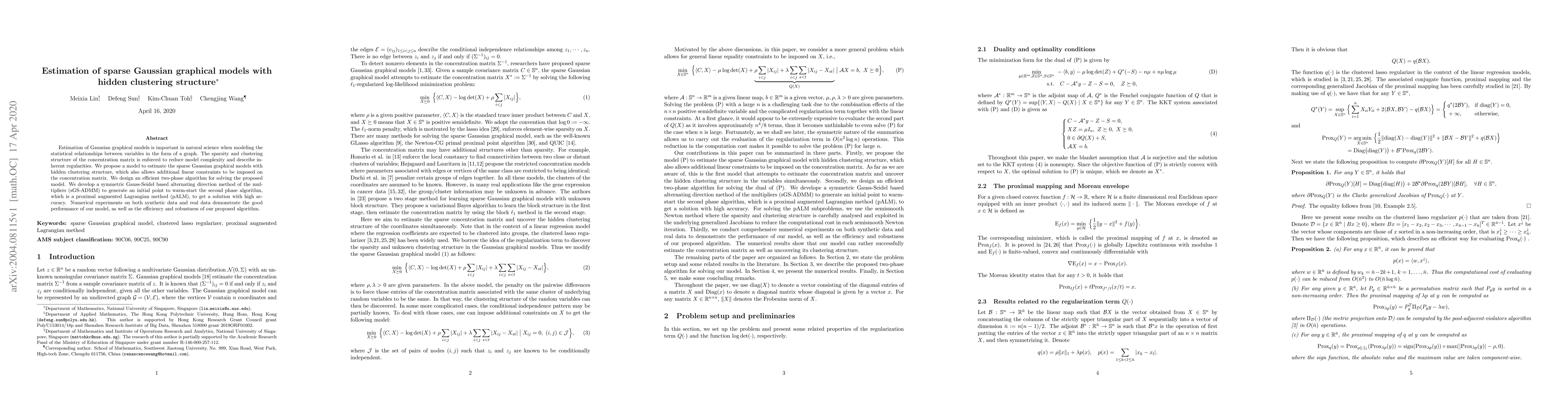 This paper proposes a method for estimating sparse Gaussian graphical models with hidden clustering structures, incorporating linear constraints. The authors introduce an efficient two-phase algorithm, combining a symmetric Gauss-Seidel based ADMM for initialization and a proximal augmented Lagrangian method for high-accuracy solution, demonstrating its effectiveness through numerical experiments on synthetic and real data.