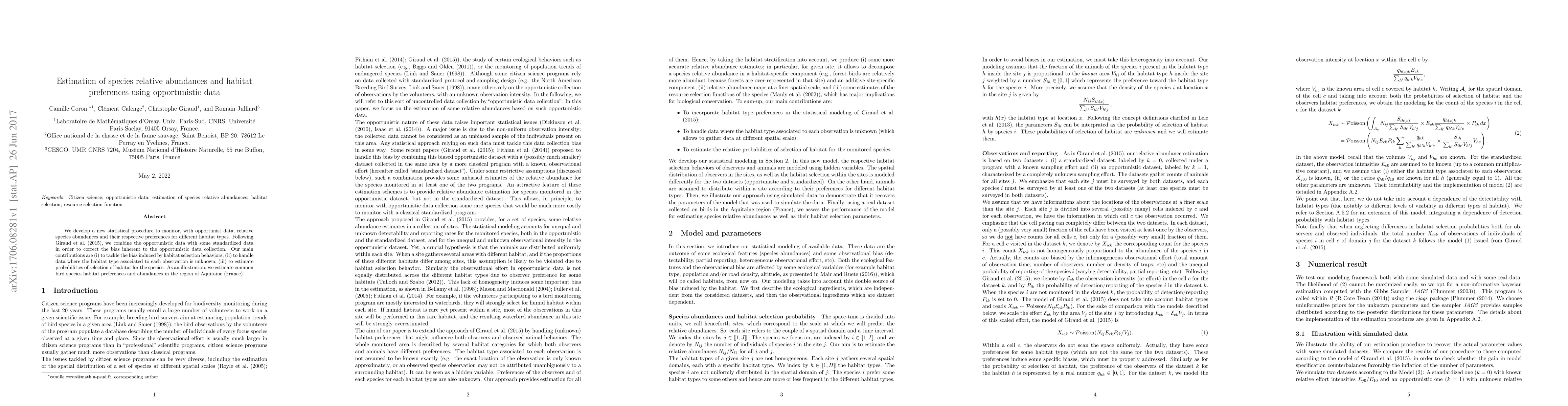 We develop a new statistical procedure to monitor, with opportunist data, relative species abundances and their respective preferences for dierent habitat types. Following Giraud et al. (2015), we combine the opportunistic data with some standardized data in order to correct the bias inherent to the opportunistic data collection. Our main contributions are (i) to tackle the bias induced by habitat selection behaviors, (ii) to handle data where the habitat type associated to each observation is unknown, (iii) to estimate probabilities of selection of habitat for the species. As an illustration, we estimate common bird species habitat preferences and abundances in the region of Aquitaine (France).