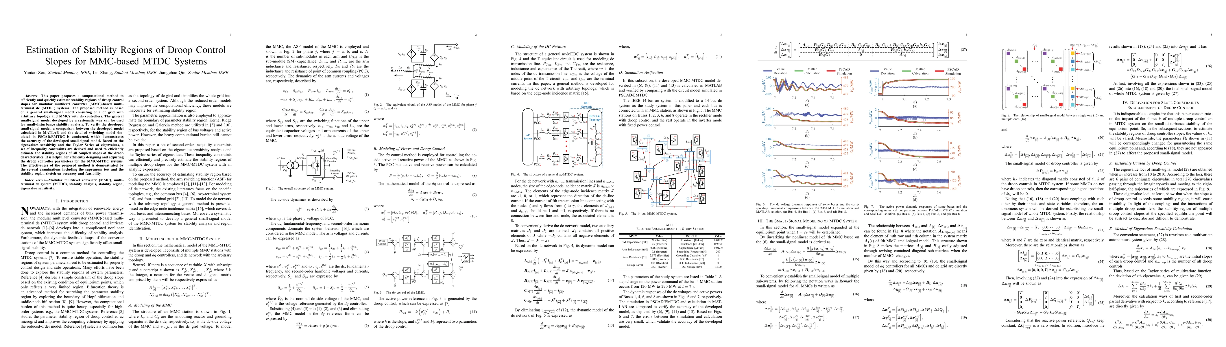 This paper proposes a computational method to efficiently and quickly estimate stability regions of droop control slopes for modular multilevel converter (MMC)-based multiterminal dc (MTDC) systems. The proposed method is based on a general small-signal model consisting of a dc grid with arbitrary topology and MMCs with dq controllers. The general small-signal model developed by a systematic way can be used for small-disturbance stability analysis. To verify the developed small-signal model, a comparison between the developed model calculated in MATLAB and the detailed switching model simulated in PSCAD/EMTDC is conducted, which demonstrates the accuracy of the developed small-signal model. Based on the eigenvalues sensitivity and the Taylor Series of eigenvalues, a set of inequality constraints are derived and used to efficiently estimate the stability regions of all coupled slopes of the droop characteristics. It is helpful for efficiently designing and adjusting the droop controller parameters for the MMC-MTDC systems. The effectiveness of the proposed method is demonstrated by the several examinations including the supremum test and the stability region sketch on accuracy and feasibility.