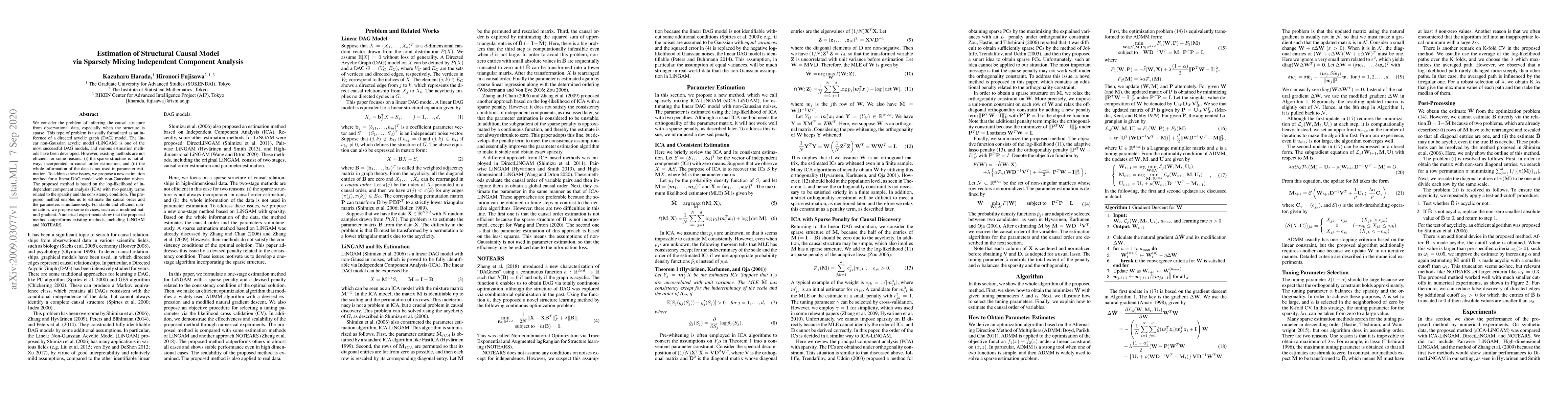 We consider the problem of inferring the causal structure from observational data, especially when the structure is sparse. This type of problem is usually formulated as an inference of a directed acyclic graph (DAG) model. The linear non-Gaussian acyclic model (LiNGAM) is one of the most successful DAG models, and various estimation methods have been developed. However, existing methods are not efficient for some reasons: (i) the sparse structure is not always incorporated in causal order estimation, and (ii) the whole information of the data is not used in parameter estimation. To address {these issues}, we propose a new estimation method for a linear DAG model with non-Gaussian noises. The proposed method is based on the log-likelihood of independent component analysis (ICA) with two penalty terms related to the sparsity and the consistency condition. The proposed method enables us to estimate the causal order and the parameters simultaneously. For stable and efficient optimization, we propose some devices, such as a modified natural gradient. Numerical experiments show that the proposed method outperforms existing methods, including LiNGAM and NOTEARS.