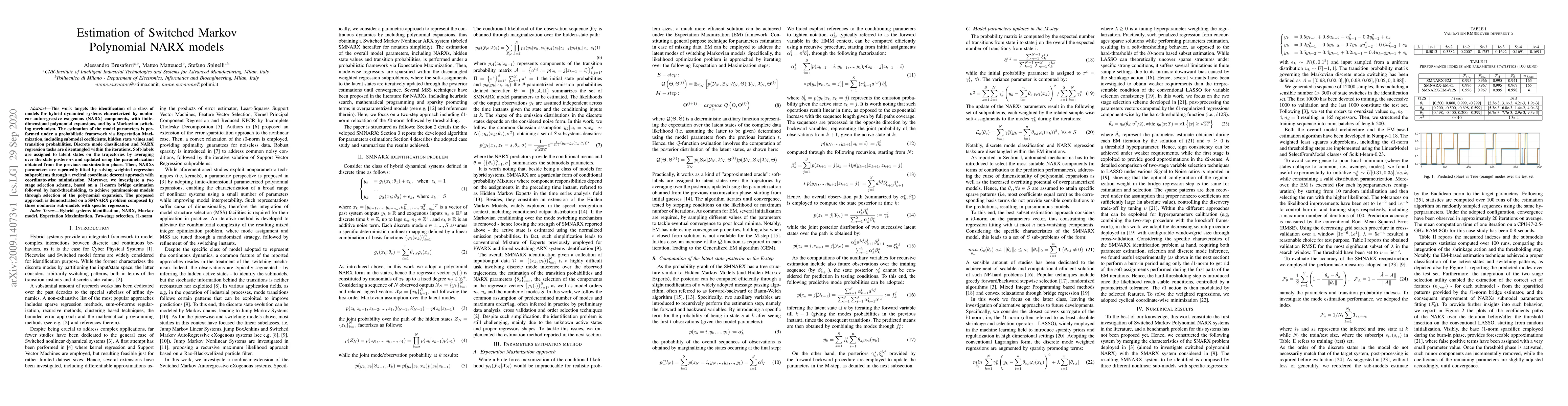 This paper proposes a probabilistic framework for estimating parameters in switched Markov polynomial NARX models using Expectation Maximization, focusing on hybrid dynamical systems. The method iteratively fits NARX parameters via weighted regression and employs a two-stage selection scheme for parsimonious model construction.