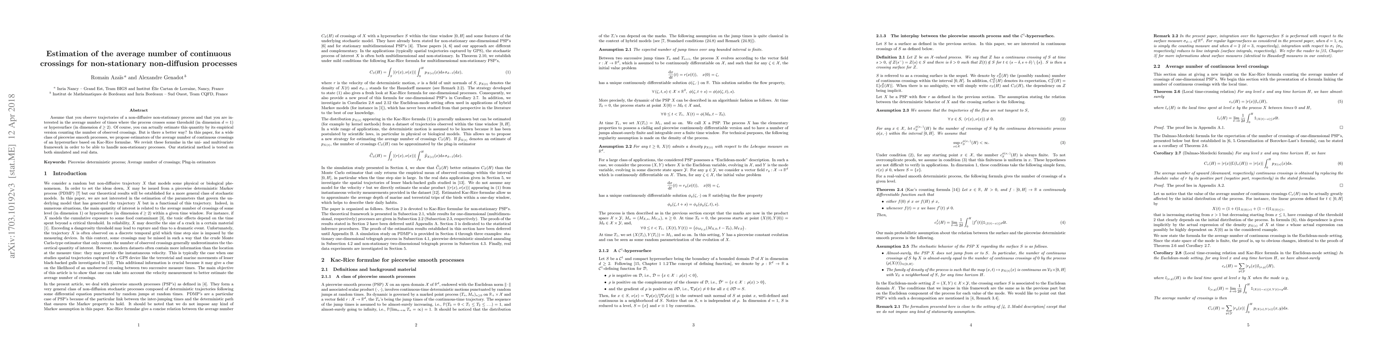 Assume that you observe trajectories of a non-diffusive non-stationary process and that you are interested in the average number of times where the process crosses some threshold (in dimension $d=1$) or hypersurface (in dimension $d\geq2$). Of course, you can actually estimate this quantity by its empirical version counting the number of observed crossings. But is there a better way? In this paper, for a wide class of piecewise smooth processes, we propose estimators of the average number of continuous crossings of an hypersurface based on Kac-Rice formulae. We revisit these formulae in the uni- and multivariate framework in order to be able to handle non-stationary processes. Our statistical method is tested on both simulated and real data.