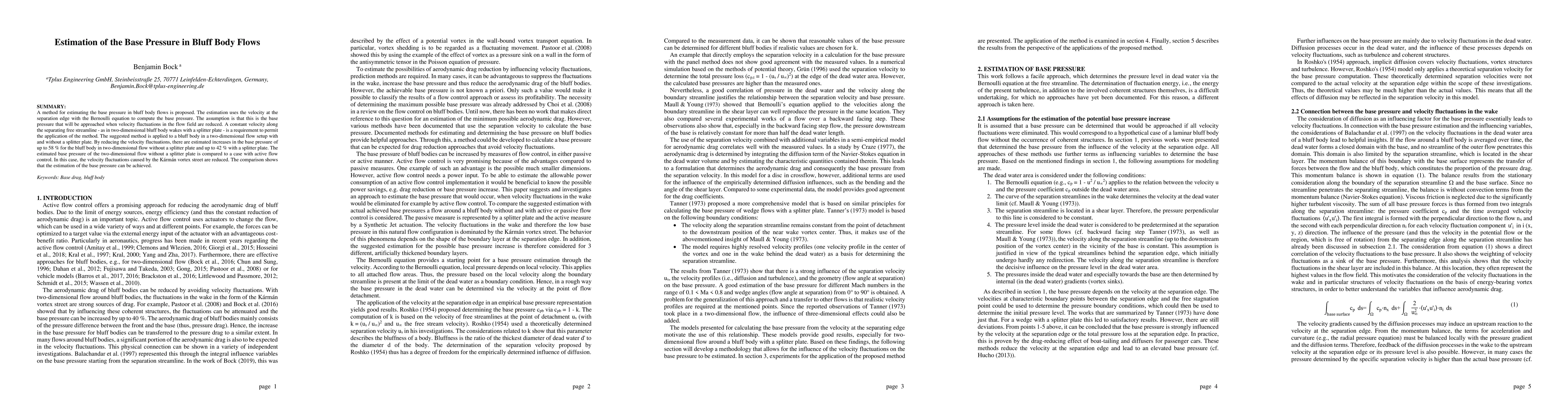 A method to estimate base pressure in bluff body flows was proposed using Bernoulli's equation, resulting in up to 58% increase in base pressure when velocity fluctuations are reduced.